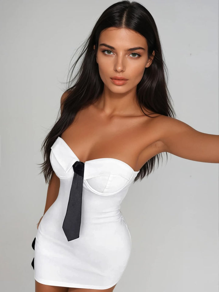 Turn heads effortlessly in the Plythra Strapless Tie Mini Dress. Its sleek strapless design highlights your shoulders, while the adjustable tie adds a custom fit and flirty touch. Perfect for nights out or special occasions, this mini dress combines style and comfort, making it a go-to piece for showing off your confident, chic side.