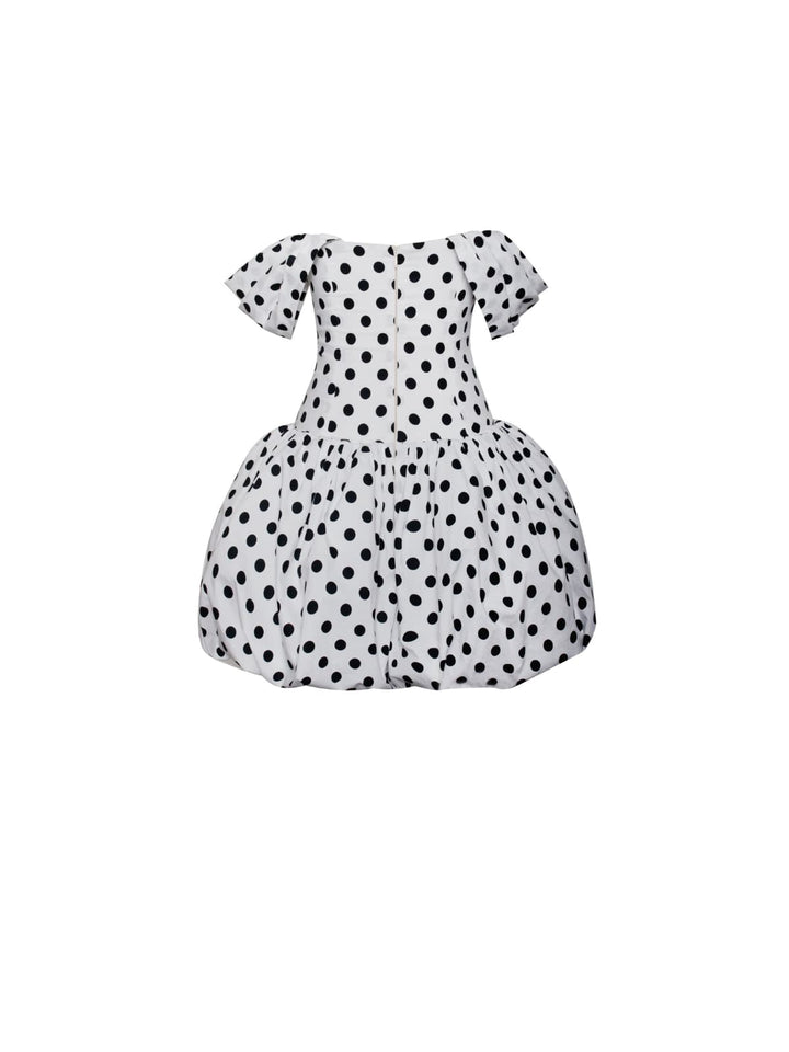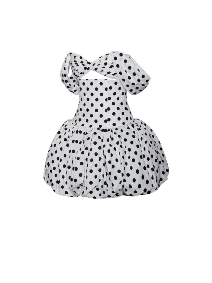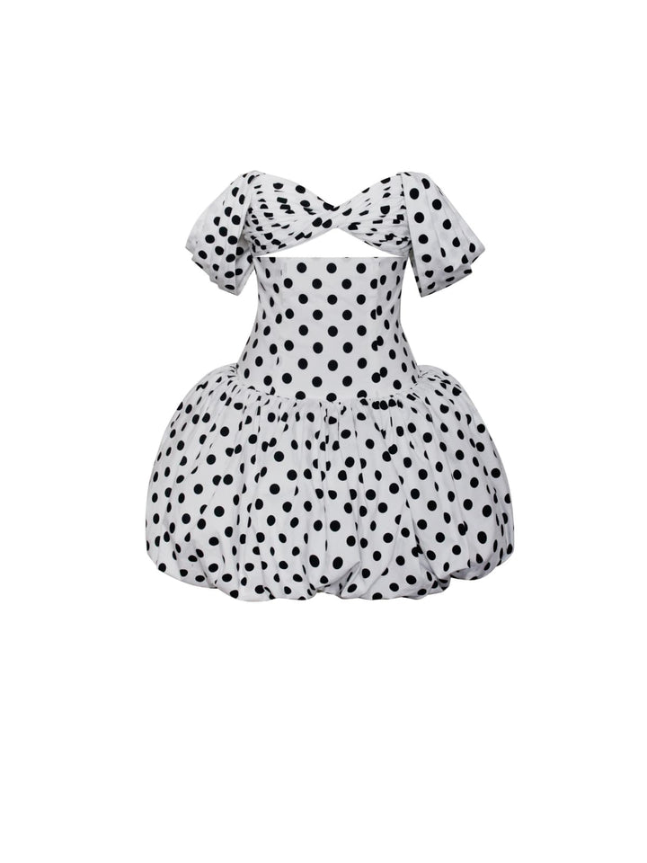 Turn heads with the Qyren Off Shoulder Dot Cutout Bubble Mini Dress. Its playful dot pattern and stylish cutouts add a flirty touch, while the off-shoulder design highlights your neckline elegantly. The bubble silhouette creates a fun, youthful shape that moves with you, perfect for parties or special outings. Elevate your wardrobe with this unique dress that blends charm and sophistication effortlessly.