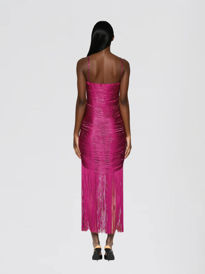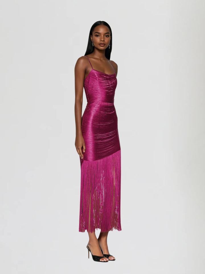 Elevate your style with the Syriel Spaghetti Fringe Maxi Dress, a graceful blend of elegance and movement. Featuring delicate spaghetti straps and playful fringe detailing, this maxi dress offers a flattering silhouette that flows effortlessly with every step. Perfect for evenings out or special occasions, it ensures you stand out with a captivating, modern charm. Embrace comfort without compromising on style in this versatile statement piece.