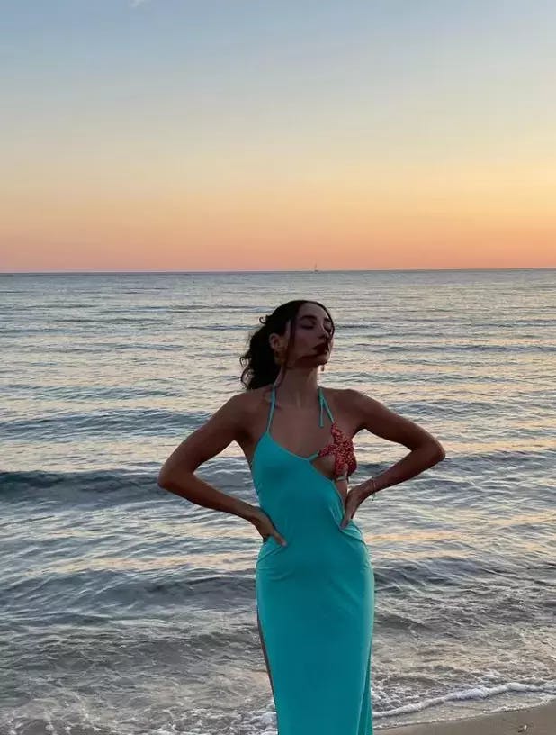 This Tosca Starfish Bustier Split Maxi Dress features a statement blue maxi dress with bold embellished rhinestone starfish and a bustier top with a split skirt for a dramatic silhouette. Step out in confidence and style with this one of a kind look.