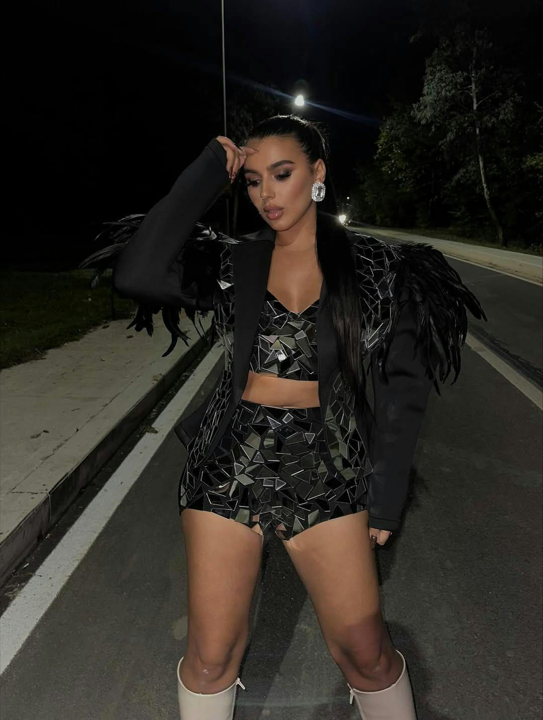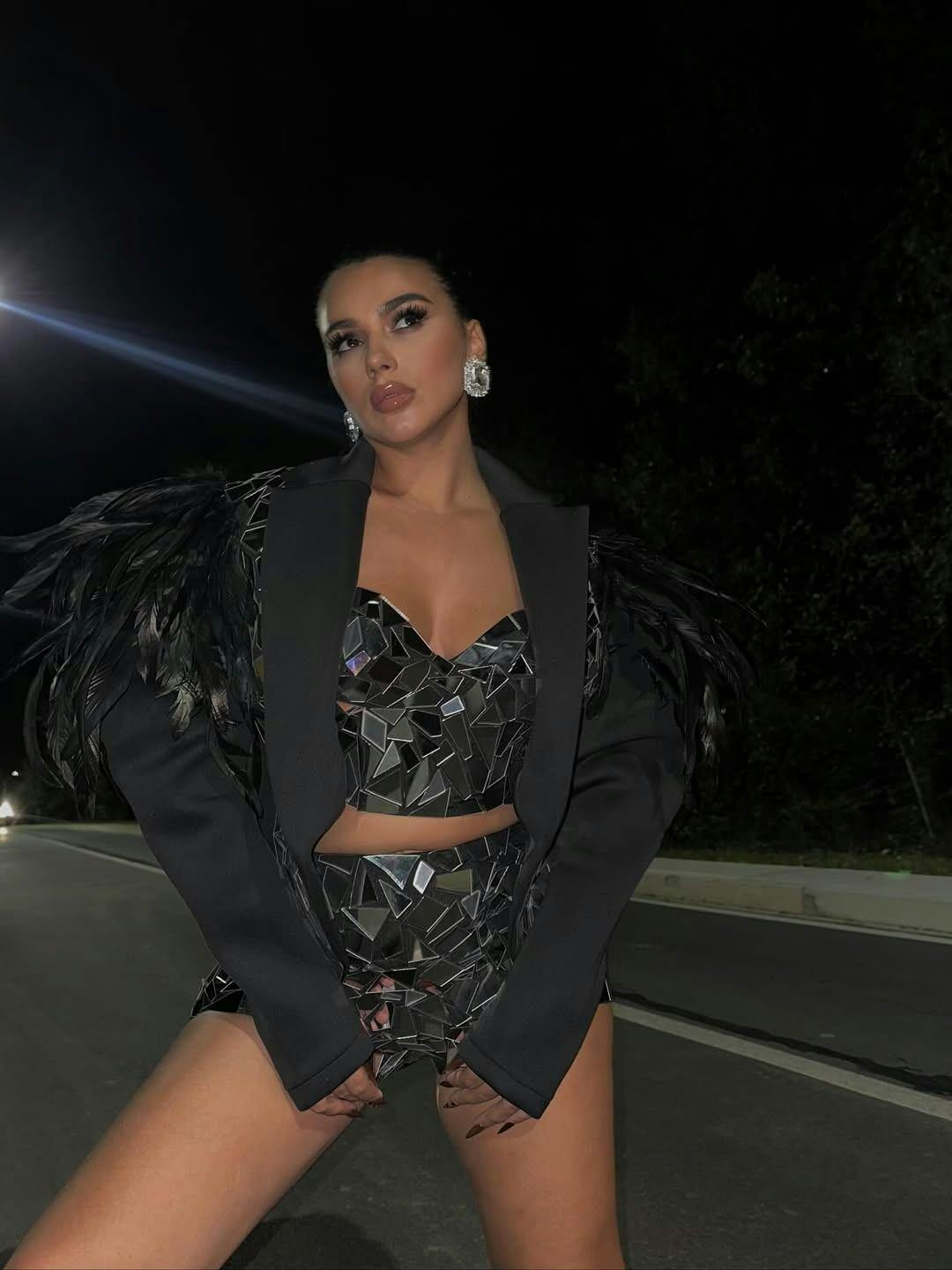 This Wendy Acrylic Feather Embellished Blazer Set features acrylic embellishments and feather trim on a three-piece blazer set. Perfect for those seeking a sophisticated and stylish addition to their wardrobe. Elevate your look with this exquisite set.