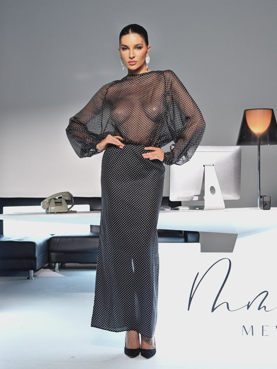 Wyvra Long Sleeve Dot Maxi Dress In Black