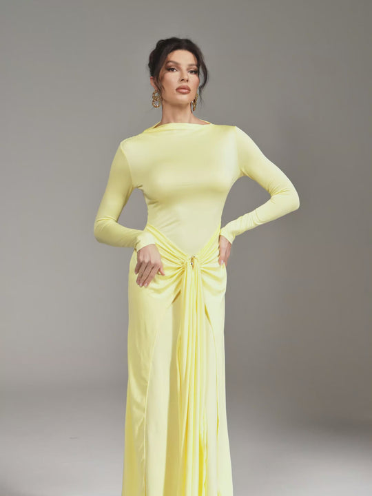 Elevate your wardrobe with the Zoltex Long Sleeve Draped Maxi Dress in Butter Yellow. This flowing maxi dress features elegant draping and long sleeves, combining comfort with timeless style. Its soft, buttery hue adds a fresh, radiant touch to any occasion, making it perfect for both daytime events and evening gatherings. Experience effortless grace and standout charm in one stunning silhouette.