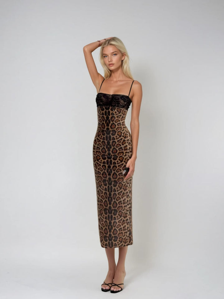 Aqualine Spaghetti Leopard Sequin Midi Dress