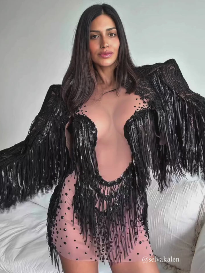 Elevate your evening wardrobe with the Cyvra Fringe Mesh Mini Dress With Coat In Black. This head-turning ensemble combines seductive mesh fabric with dynamic fringe details that catch the light with every movement. The accompanying coat offers versatile styling options, allowing you to reveal or conceal as the occasion demands. Designed for the confident woman who isn't afraid to make an impression, this dress promises to be your go-to statement piece for unforgettable nights out.