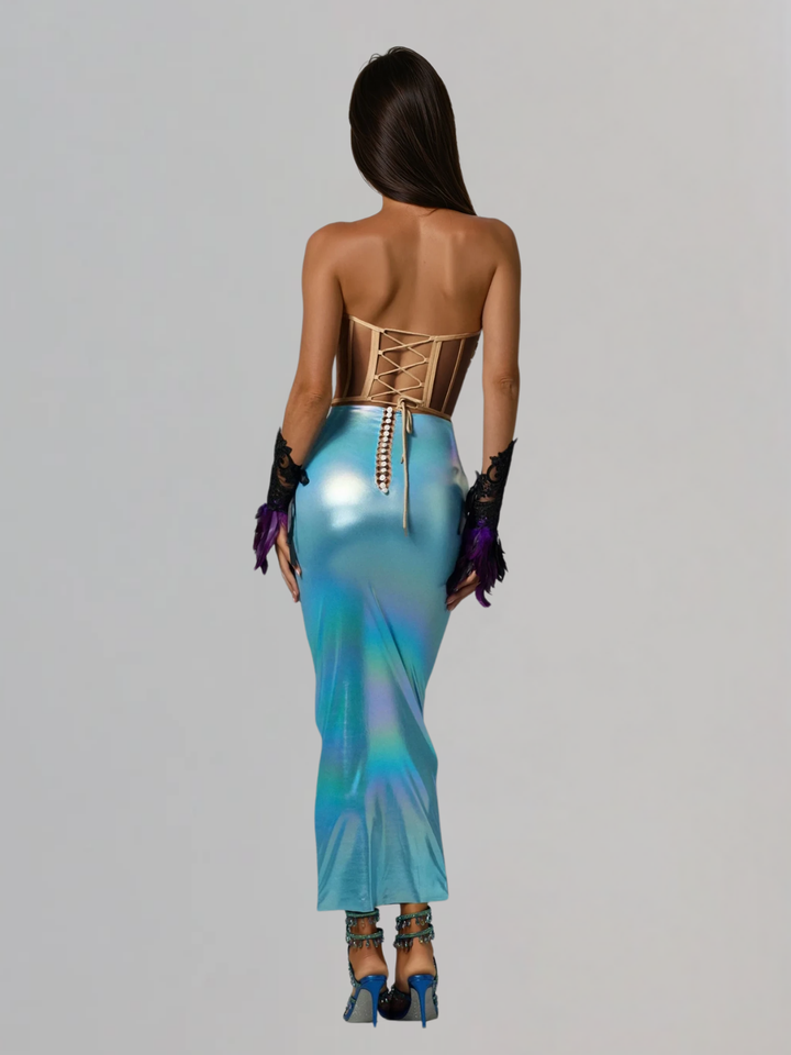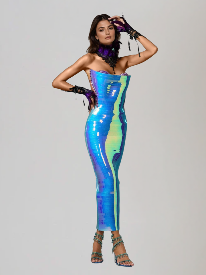 Elevate your style with our Eadward Strapless Metallic Midi Dress! Dazzle in its blue hue and metallic sheen. The strapless design adds a touch of elegance while the midi length ensures comfort and versatility. Perfect for any special occasion, this dress will make you shine!