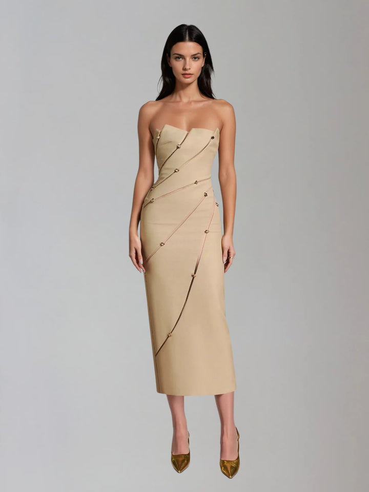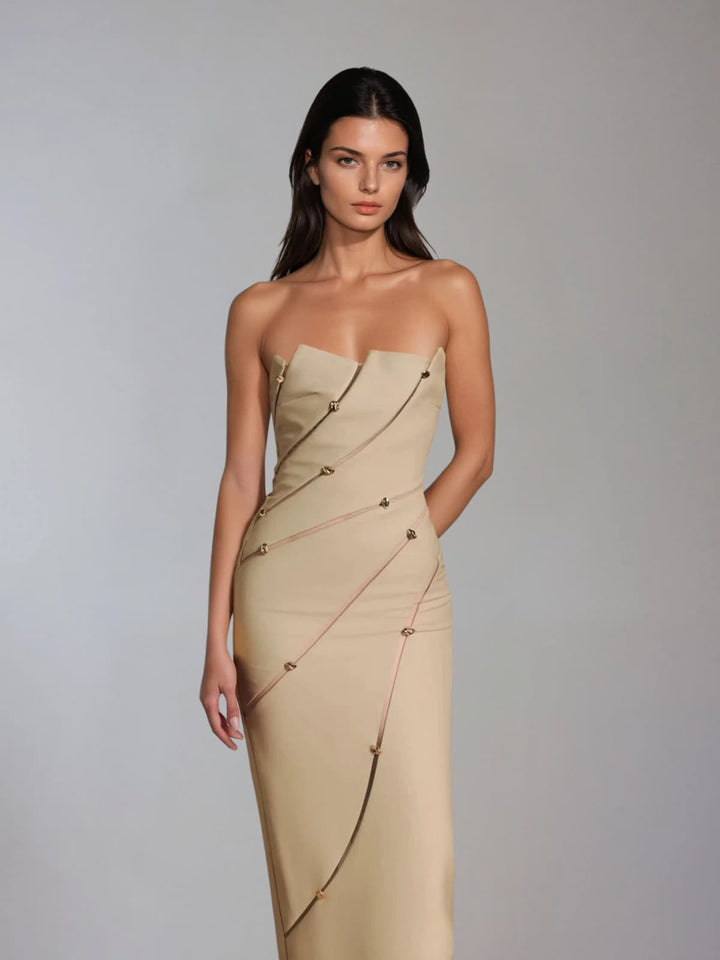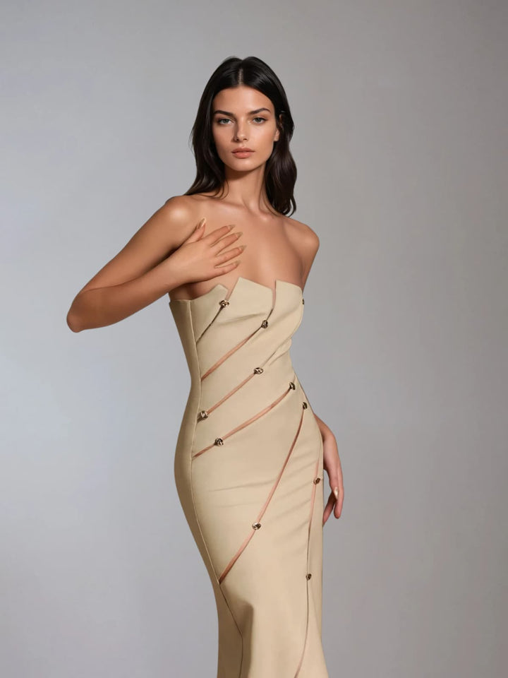Elevate your style with the Laethar Strapless Maxi Dress in Khaki. This elegant, flowing dress features a strapless design that highlights your neckline while offering effortless comfort. Its versatile khaki shade pairs perfectly with both casual and formal occasions, making it a must-have for your wardrobe. Whether you're attending a summer party or a nighttime event, this maxi dress promises a flattering fit and timeless appeal. Make every moment memorable with Laethar.