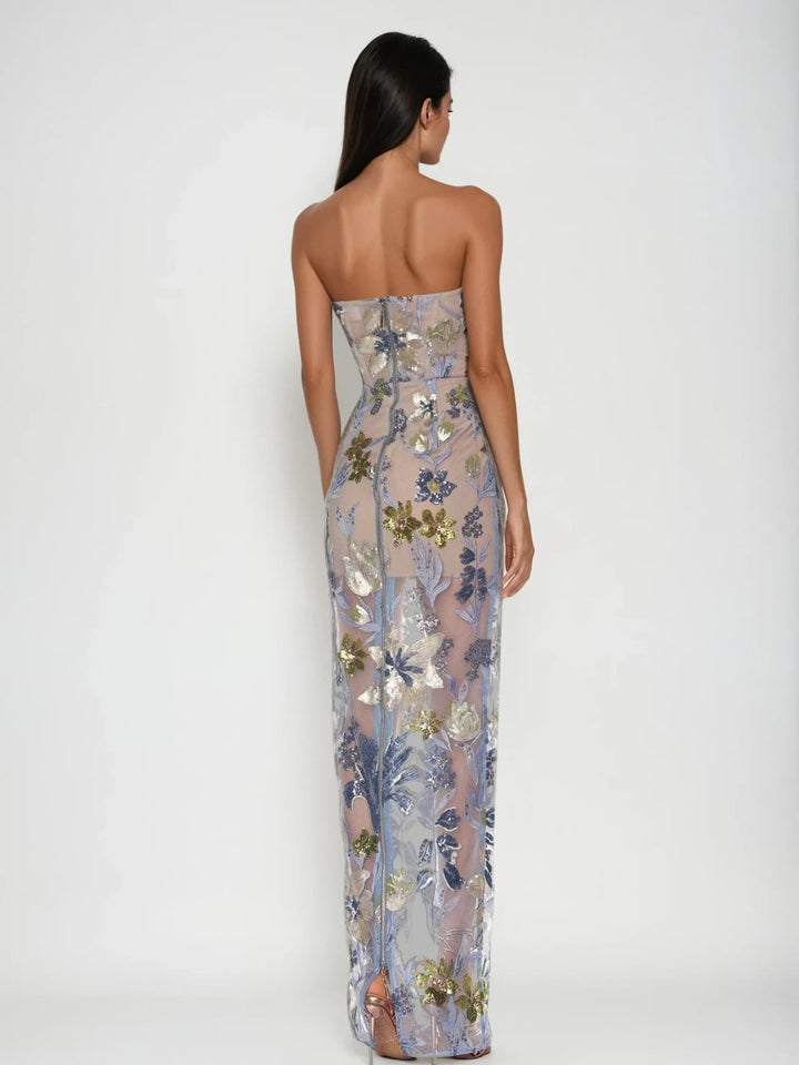 Make a dazzling statement with the Nakoa Strapless Sequin Embroidered Maxi Dress in Blue. This stunning dress features intricate sequin embroidery that catches the light beautifully, while the strapless design highlights your neckline and shoulders with elegance. Perfect for glamorous events, it combines sophistication and sparkle to ensure you shine with confidence all night long.