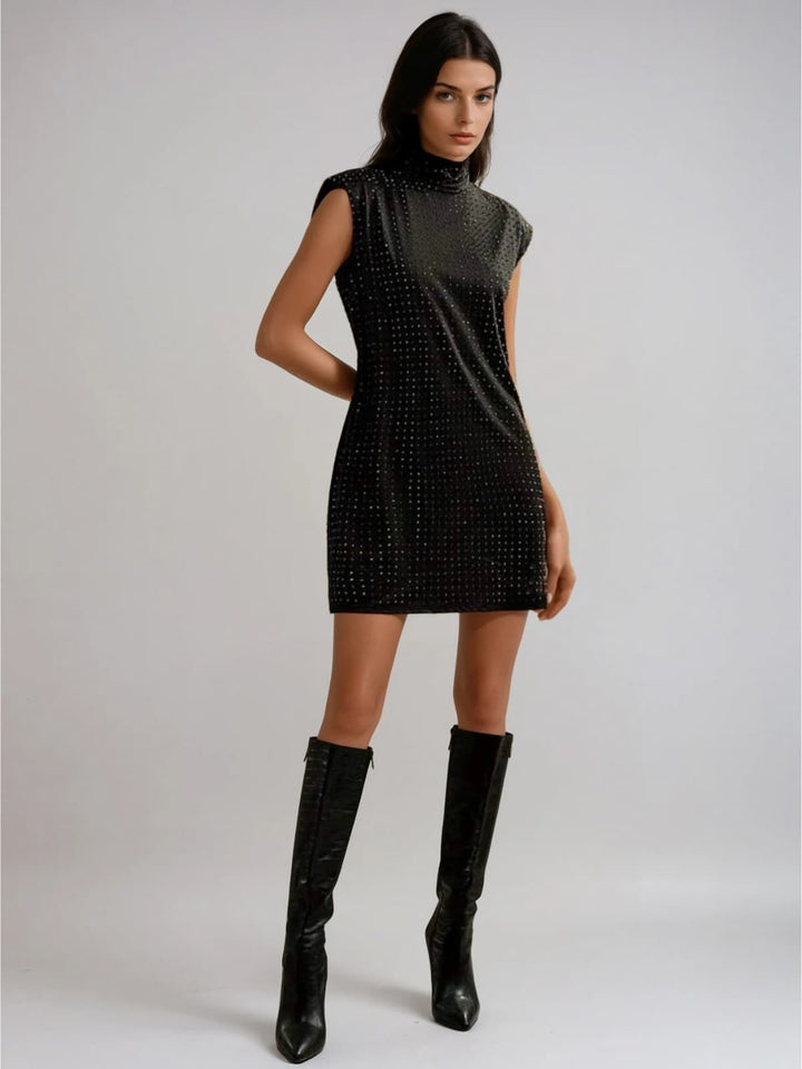 Turn heads effortlessly with the Pxion High Neck Rhinestones Mini Dress. This dazzling piece features shimmering rhinestones that catch the light with every movement, paired with a chic high neck design for a sophisticated edge. Perfect for parties or special occasions, its flattering mini length highlights your silhouette while making a bold style statement. Elevate your wardrobe with this glamorous dress that blends sparkle and elegance in one unforgettable look.