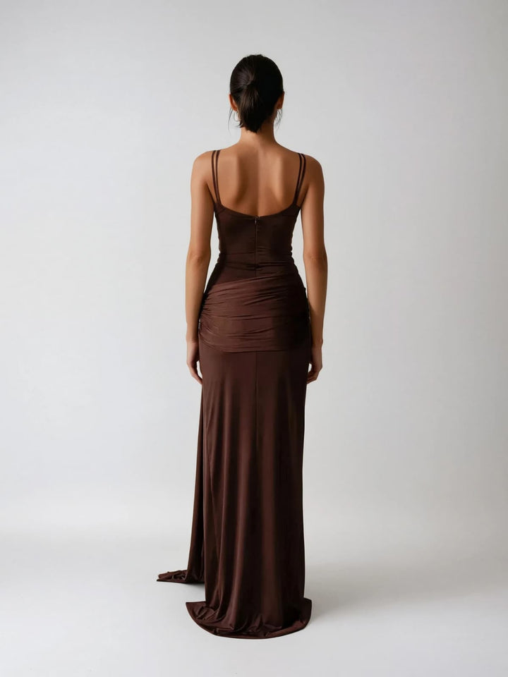 Elevate your elegance with the Pzron Ruched Draped Split Maxi Dress. Its flattering ruched design and graceful draping accentuate your silhouette, while the daring split adds a touch of allure. Perfect for making a lasting impression at any special event or evening affair.
