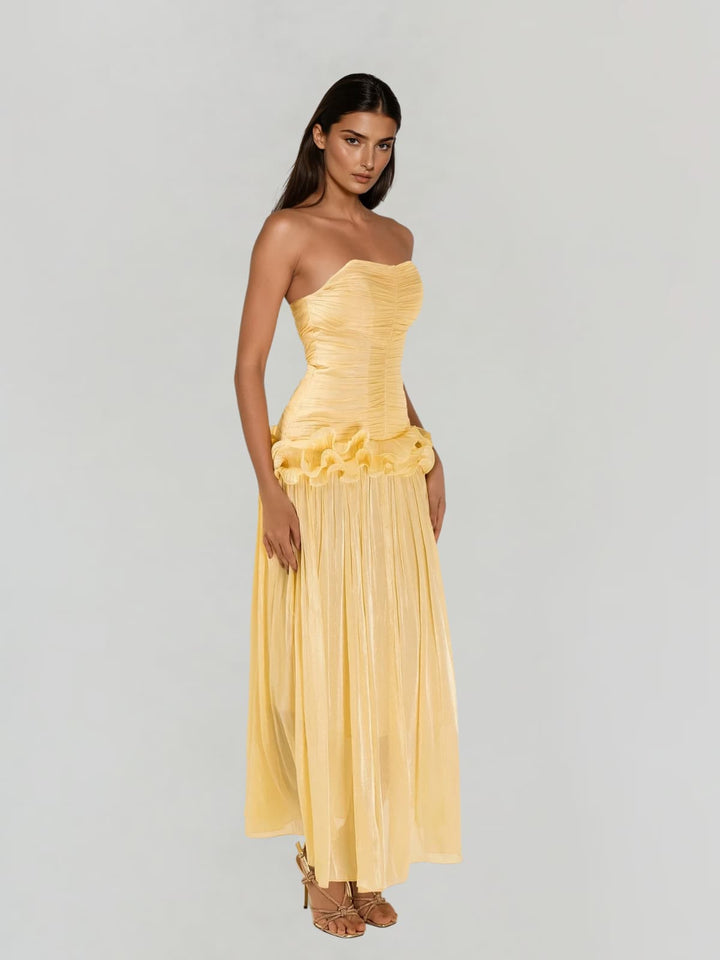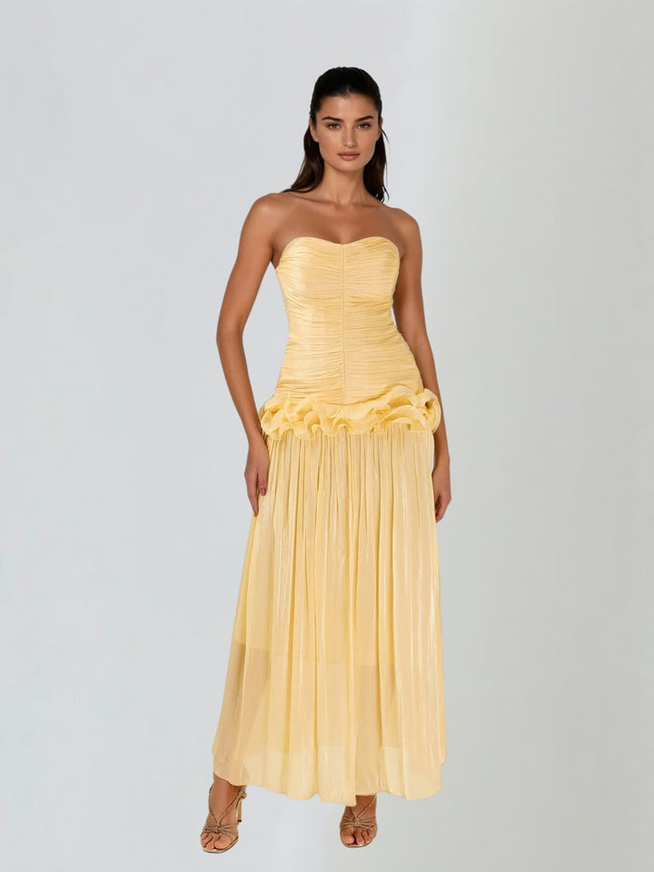 Yryviel Strapless Ruched Ruffle Maxi Dress In Yellow