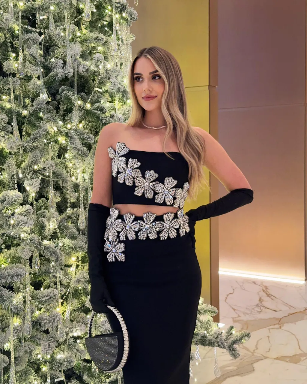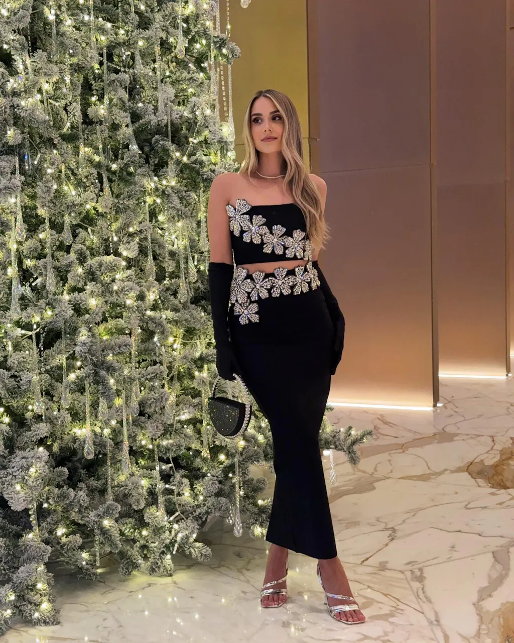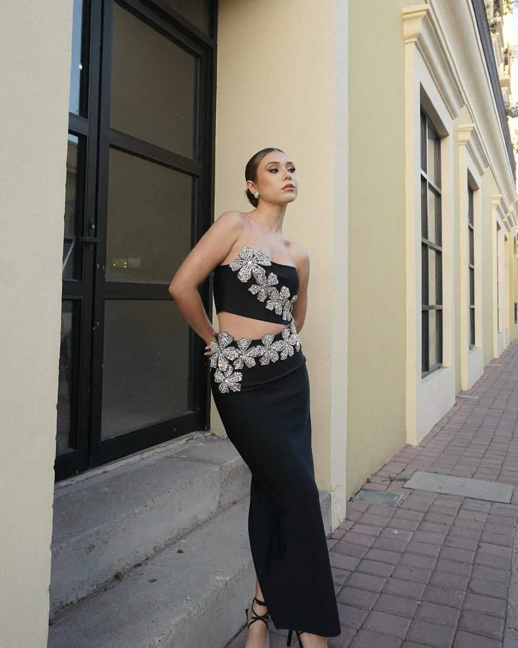 Almira Strapless Flower Bandage Skirt Set In Black