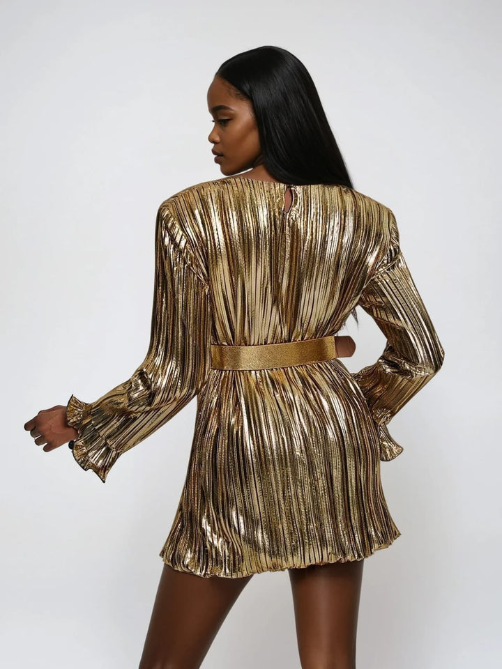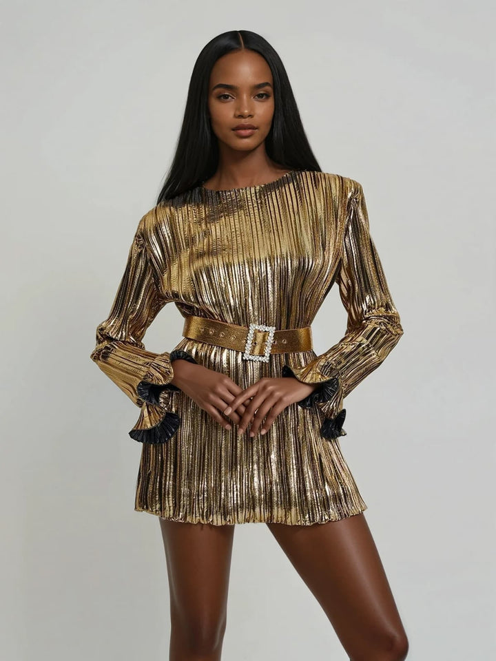 Radiate luxury in the Cerelia Long Sleeve Buckled Metallic Mini Dress in Gold. This show-stopping piece combines glamorous metallic fabric with sophisticated long sleeves and a striking buckled detail that commands attention. Perfect for special occasions or nights out, the mini silhouette flatters while the rich gold finish ensures you'll shine brighter than the rest. Elevate your evening wardrobe with this statement dress that transforms any moment into an unforgettable occasion.