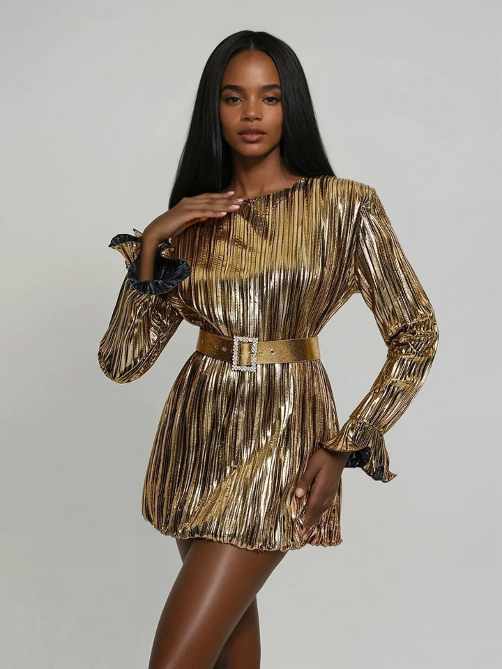 Cerelia Long Sleeve Buckled Metallic Mini Dress In Gold