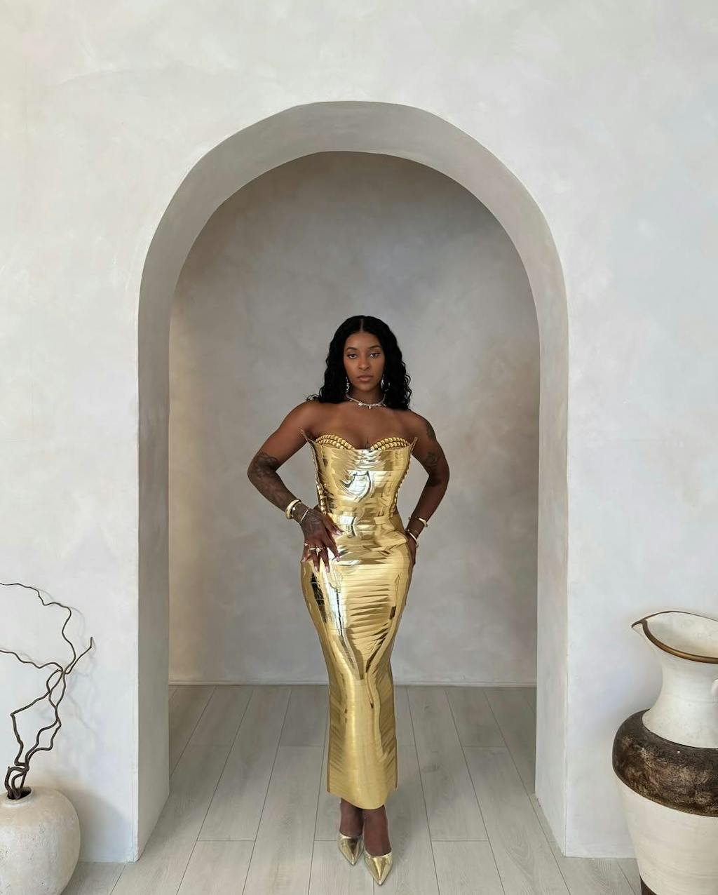 Elevate your style with our Eadward Strapless Metallic Midi Dress! Dazzle in its gold hue and metallic sheen. The strapless design adds a touch of elegance while the midi length ensures comfort and versatility. Perfect for any special occasion, this dress will make you shine!