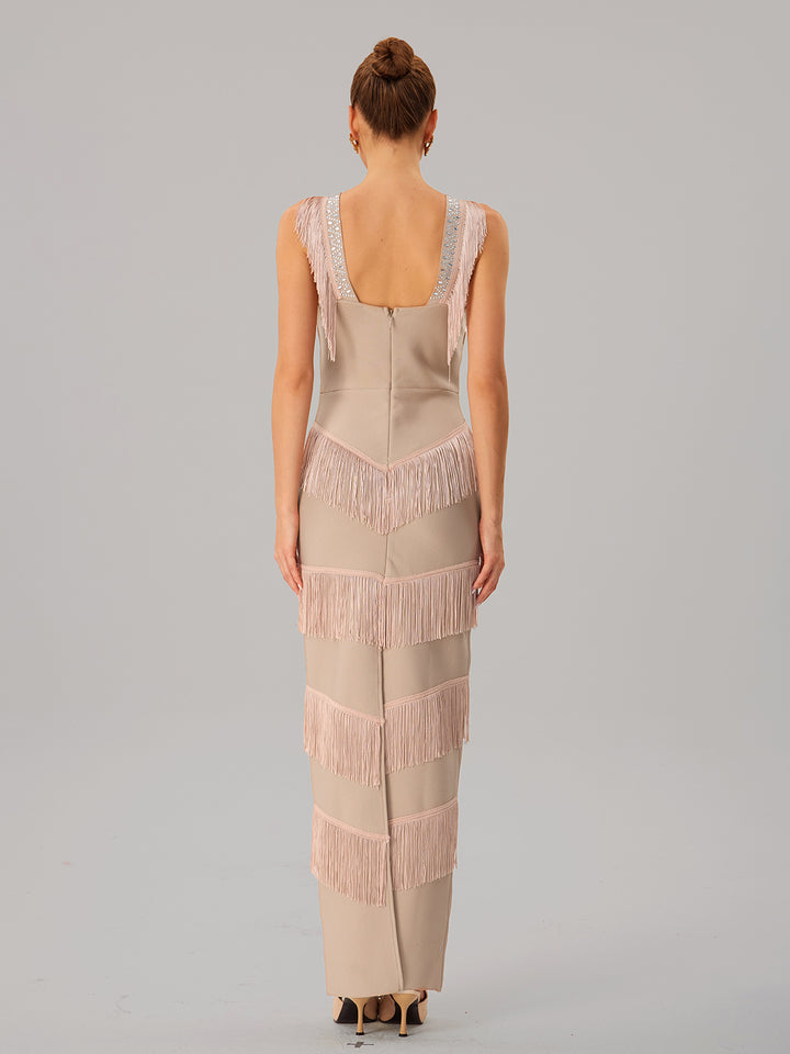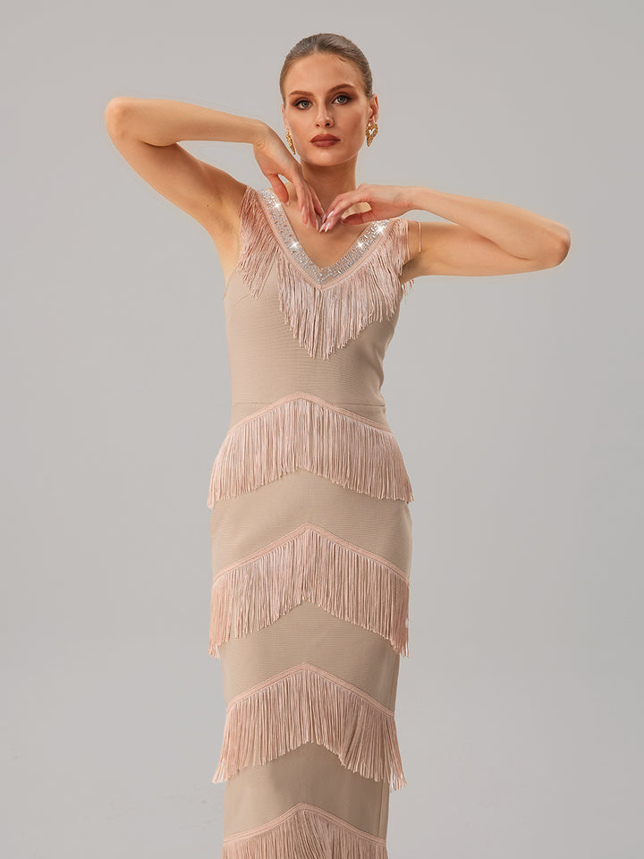 Kaleidrix V Neck Fringe Split Bandage Maxi Dress