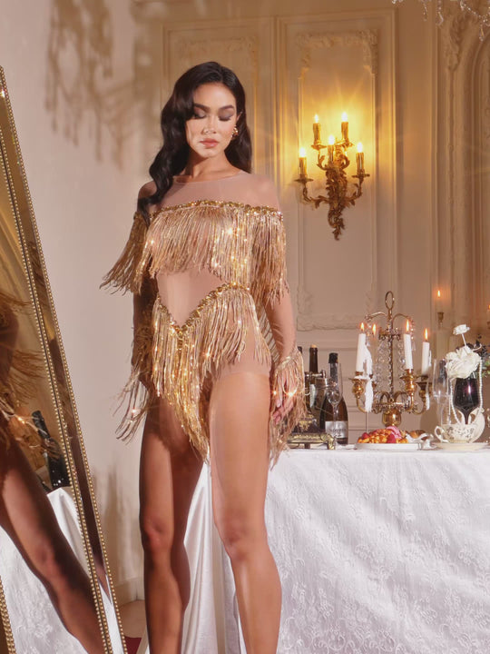 Axiom Long Sleeve Fringe Bodysuit In Gold