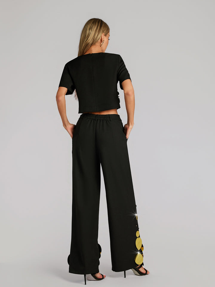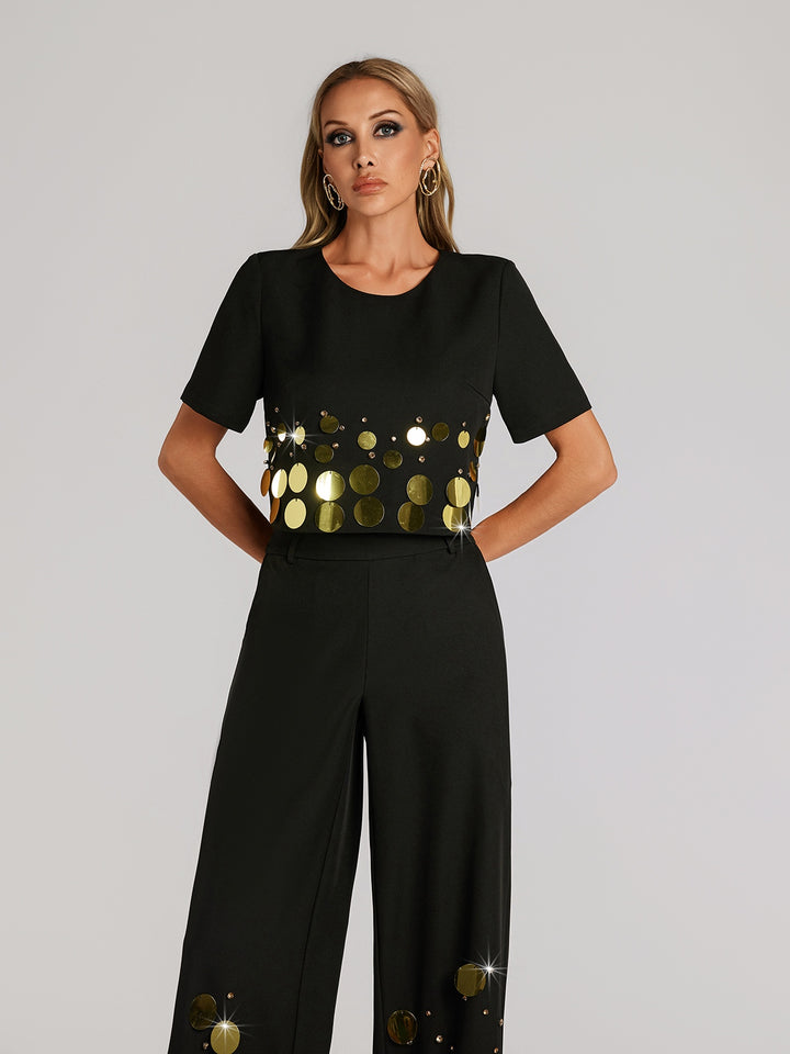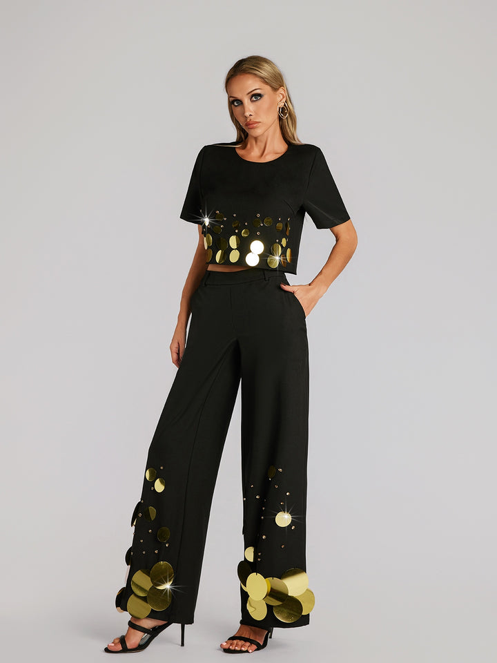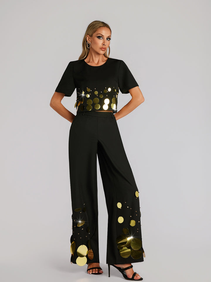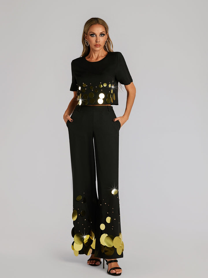 Elevate your wardrobe with the Farhana Short Sleeve Sequin Pants Set—a show-stopping ensemble that combines comfort with glamour. The shimmering sequin details catch the light beautifully, making you the center of attention at any occasion. Featuring a relaxed short sleeve top paired with matching sequin pants, this coordinated set offers effortless style without the hassle of mixing and matching. Perfect for parties, nights out, or whenever you want to feel confident and fabulous. Transform your look with one stunning piece that delivers maximum impact.