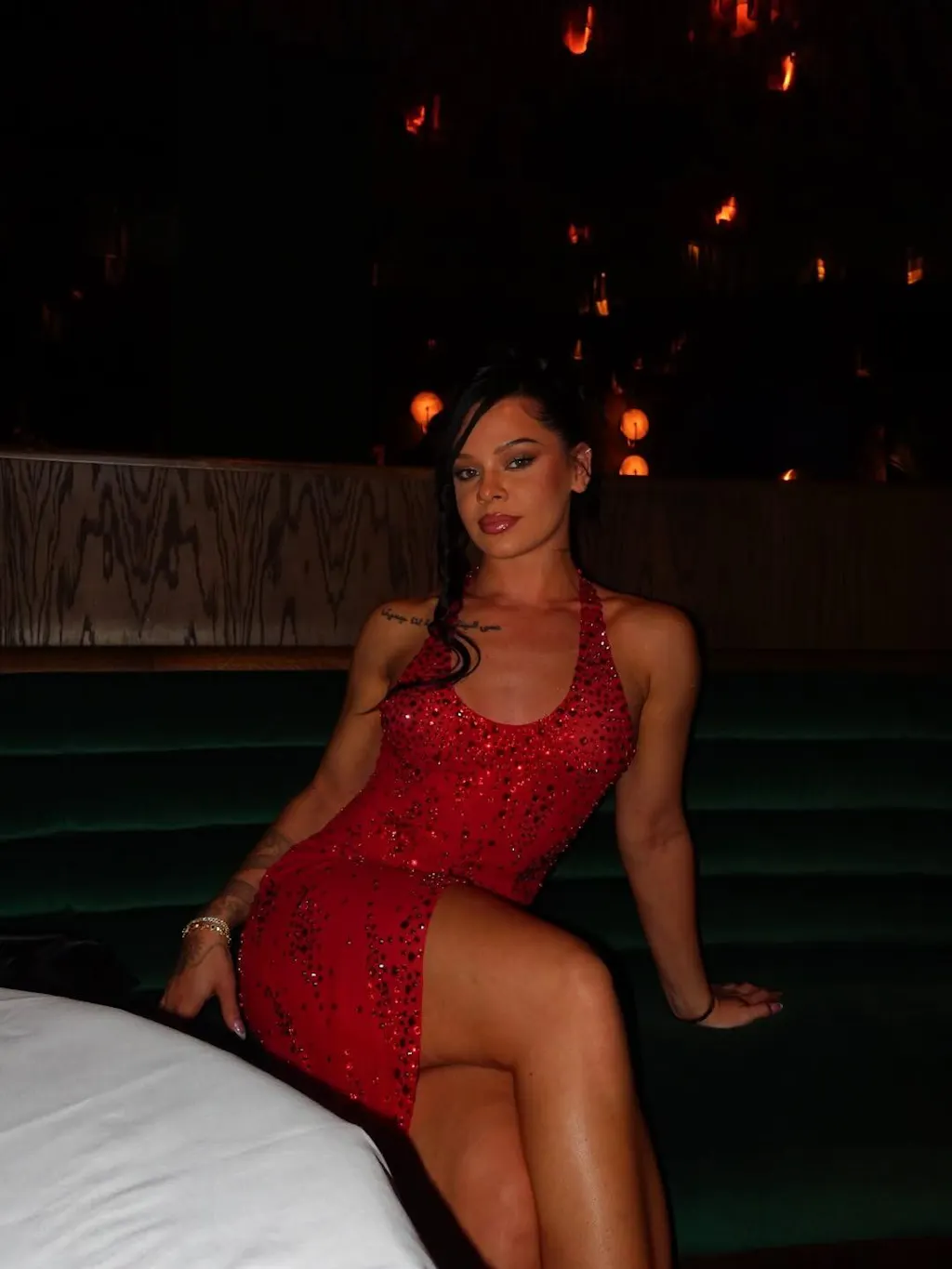 Haelin Spaghetti Rhinestone Split Midi Dress In Red