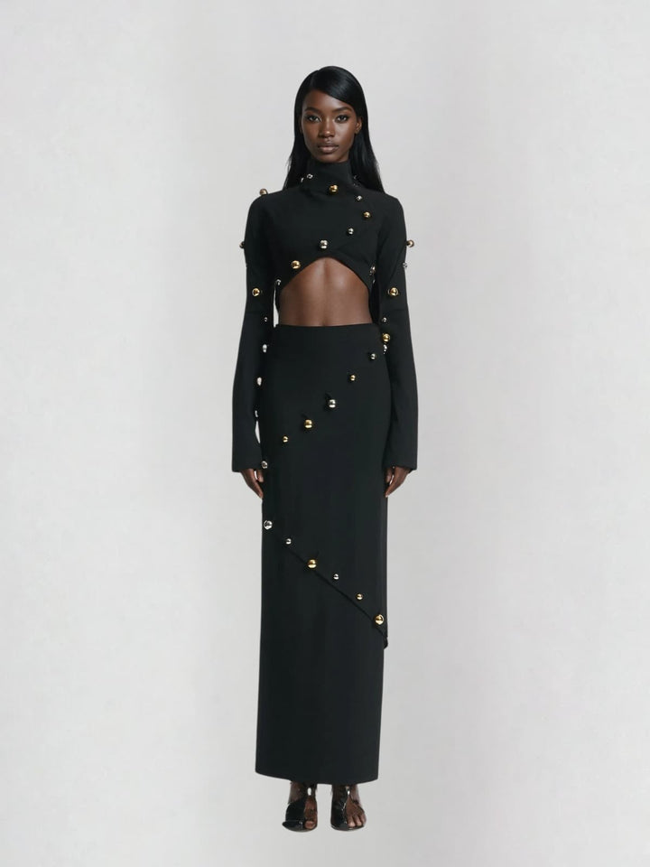 Elevate your style with the Carinae High Neck Split Skirt Set. Featuring a sleek high neckline paired with a sophisticated split skirt, this set effortlessly combines elegance and modern flair. Perfect for making a confident statement at any event, it offers both comfort and a flattering silhouette. Upgrade your wardrobe with this versatile and chic ensemble that transforms your look from day to night.