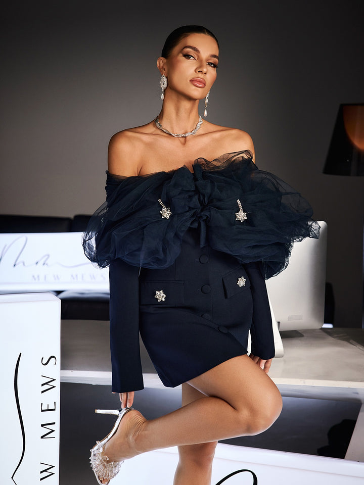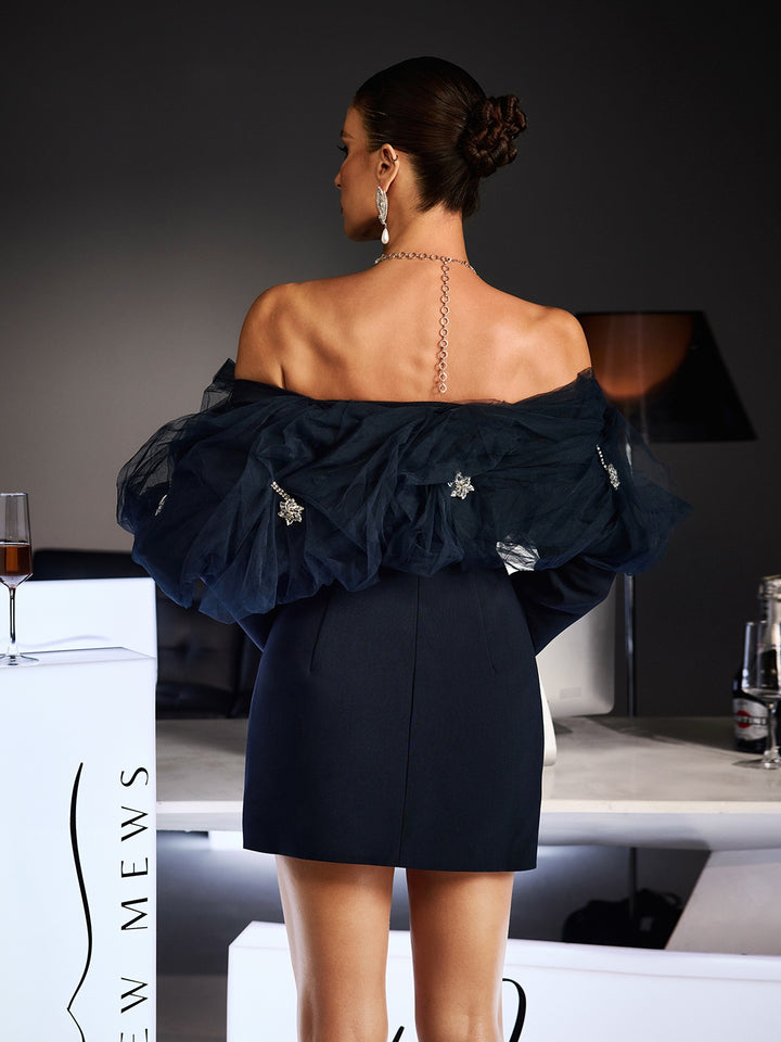 Ferchar Off Shoulder Ruffle Mesh Mini Dress