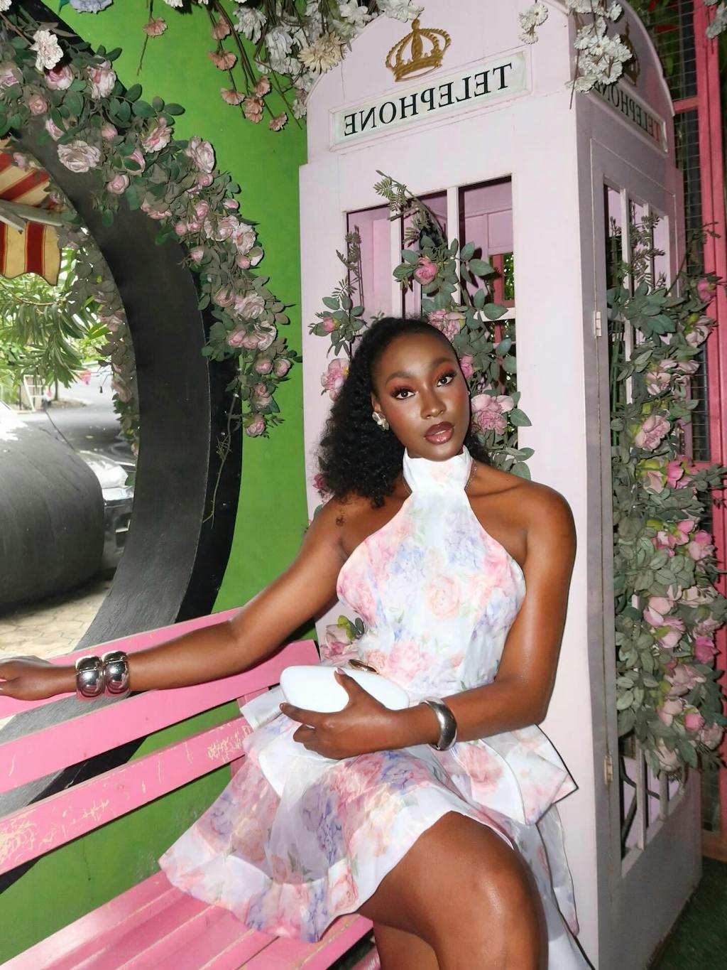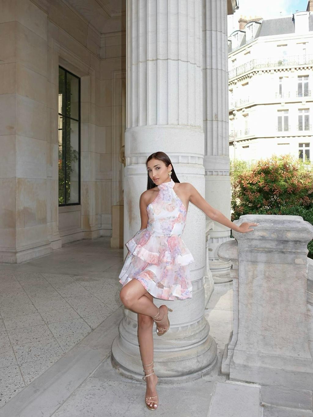 Alecto Backless Flower Printed Bow Mini Dress
