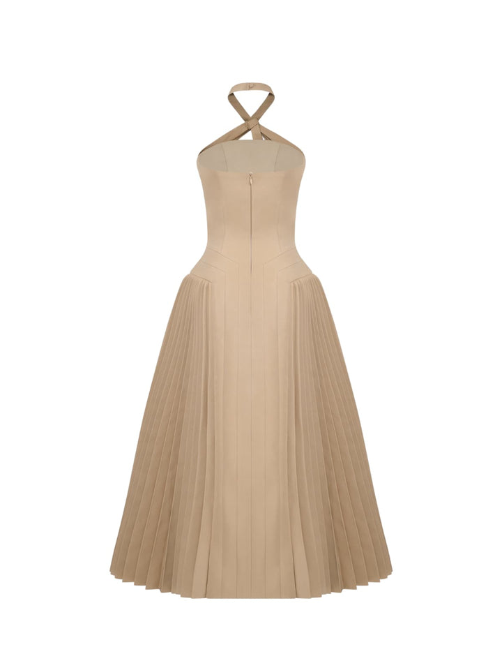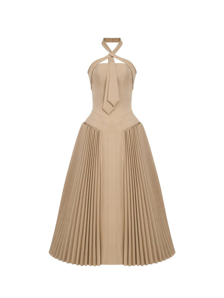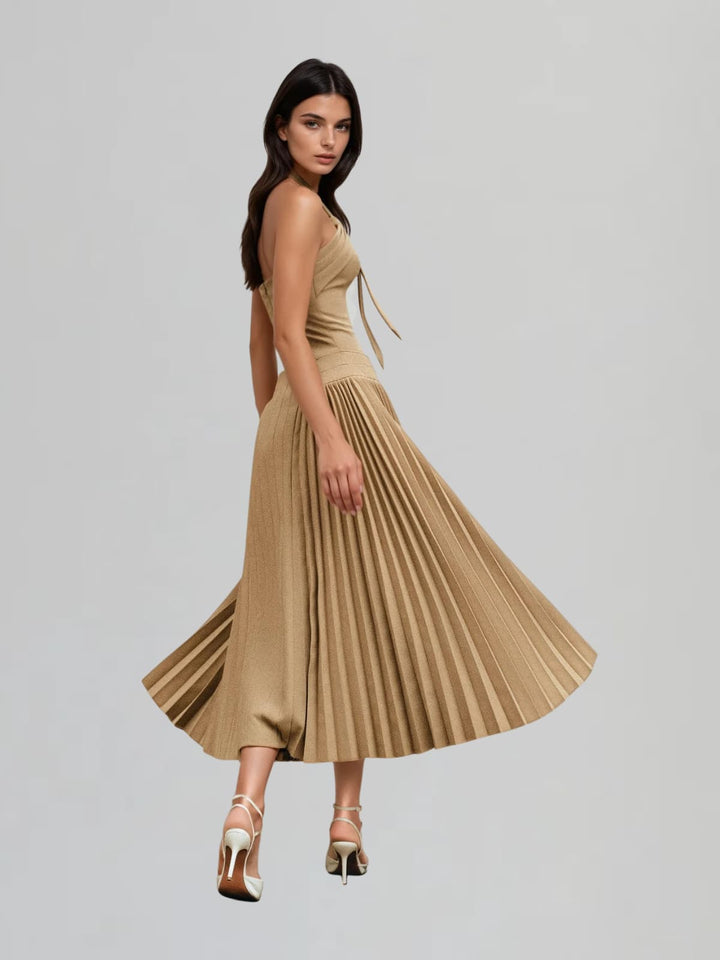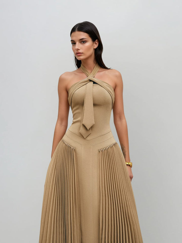 Elevate your wardrobe with the Cyrene Halterneck Tie Pleated Midi Dress—a sophisticated piece that seamlessly transitions from day to evening. The striking halterneck design frames your shoulders beautifully while the adjustable tie closure offers a personalized fit. Graceful pleats flow through the midi length, creating elegant movement with every step. Perfect for those who appreciate timeless style with modern flair, this dress delivers versatility and confidence in one stunning silhouette.