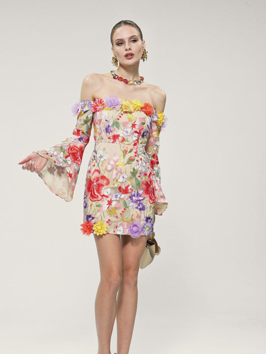 Deltria Off Shoulder Flower Embroidered Mini Dress