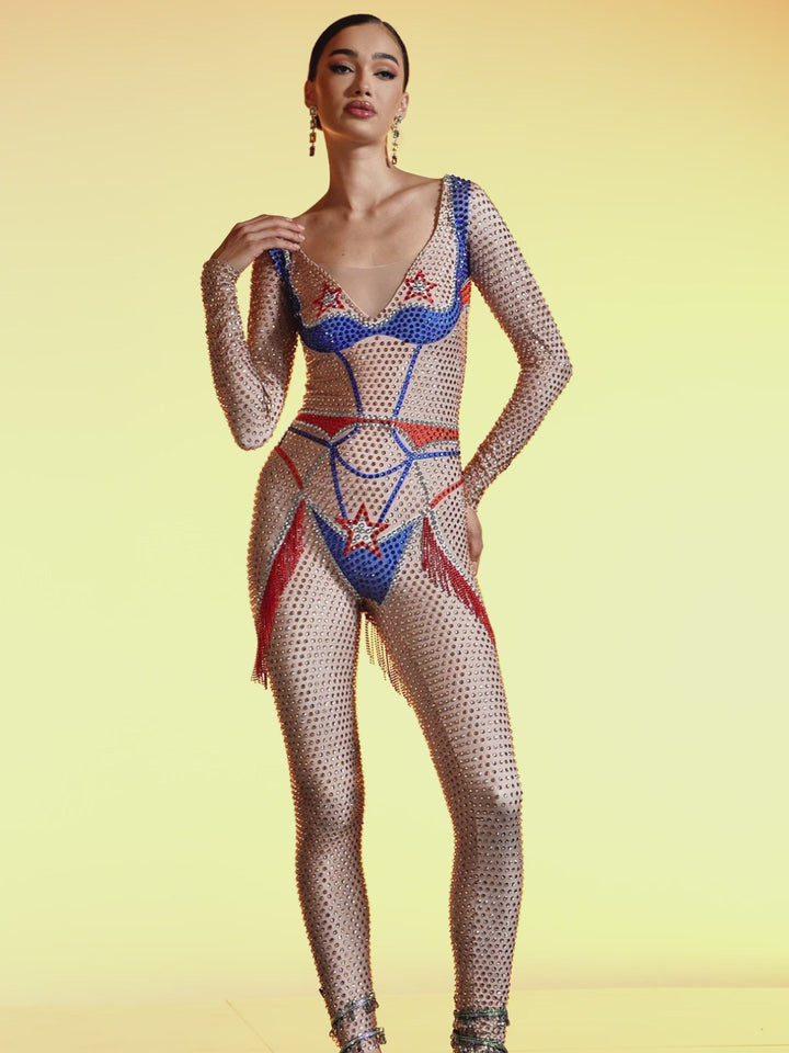 Elevate your style with the Dystara Diamond Fringe Printed Jumpsuit—a bold statement piece that combines eye-catching diamond prints with playful fringe detailing. This versatile one-piece silhouette flatters your figure while offering effortless sophistication for any occasion. Whether you're heading to a night out or making an impression at an event, the dynamic print and textured fringe create movement and dimension that turns heads. Comfortable enough for all-day wear yet striking enough to command attention, this jumpsuit is the ultimate wardrobe essential for those who dare to stand out.