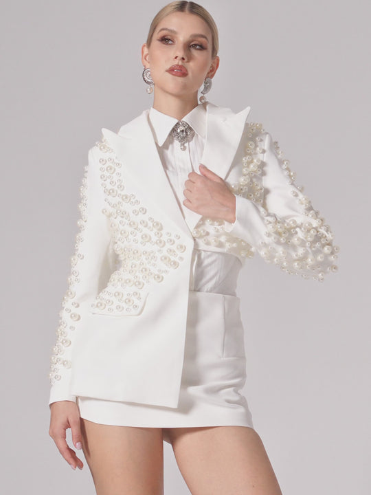 Make a bold statement with the Egil Pearl Asymmetric Blazer Set, where architectural design meets refined sophistication. The striking asymmetric cut creates visual interest and dimension, while the pearl finish adds a luminous touch that catches the light beautifully. This set piece works as a complete ensemble or separates for maximum styling flexibility. Whether you're commanding the boardroom or turning heads at an event, this fashion-forward blazer set ensures you stand out with confidence and undeniable style.