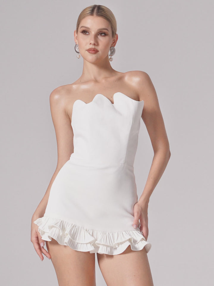 Turn heads in the Eglantine Strapless Ruffle Mini Dress, a show-stopping piece designed for those who love to make an impression. The strapless silhouette offers a chic, modern edge while cascading ruffles add romantic movement and dimension. This mini dress flatters your figure with its carefully crafted cut, making it ideal for nights out, celebrations, or any occasion where you want to feel confident and radiant. Invest in a dress that delivers instant glamour and timeless appeal.