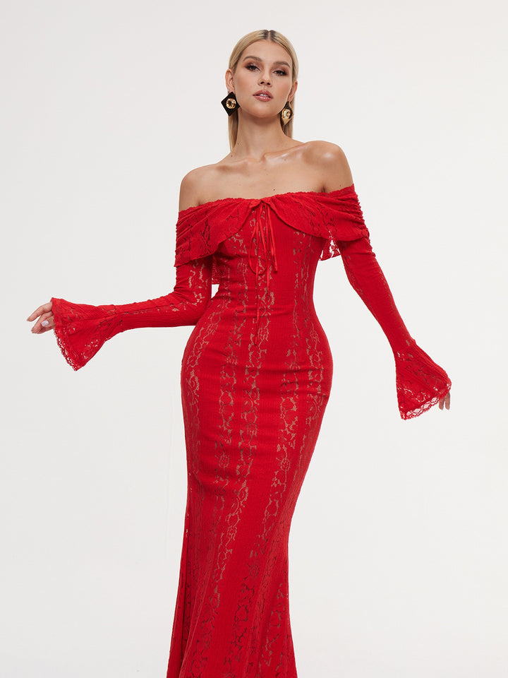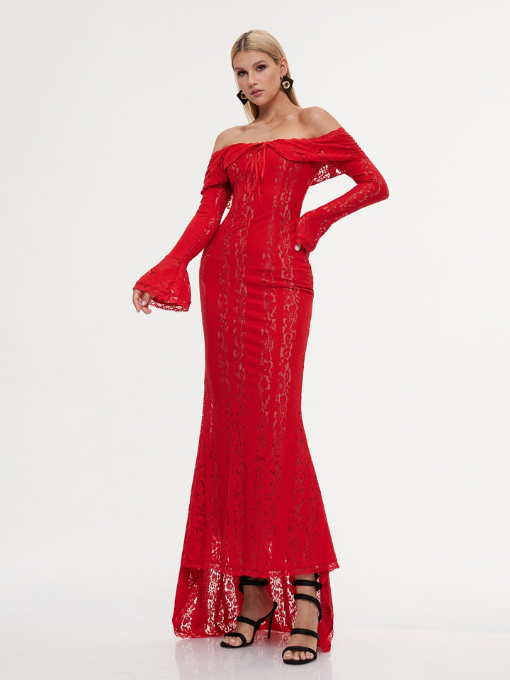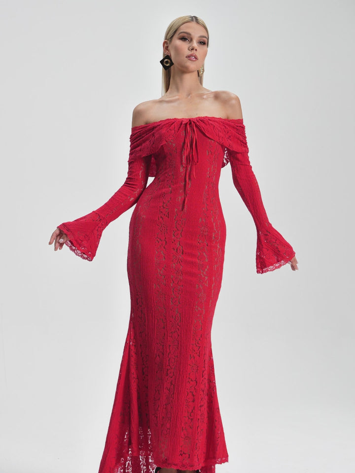 Elevate your evening elegance with the Entropia Off Shoulder Lace Maxi Dress. This stunning piece features delicate lace detailing and a romantic off-shoulder neckline that frames your shoulders beautifully. The flowing maxi silhouette creates a graceful, elongated line perfect for formal events, weddings, or special occasions. Crafted for comfort and style, this dress combines timeless sophistication with contemporary flair. Whether you're attending a gala or making a memorable entrance, the Entropia dress delivers the refined glamour you deserve.