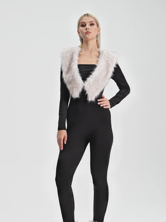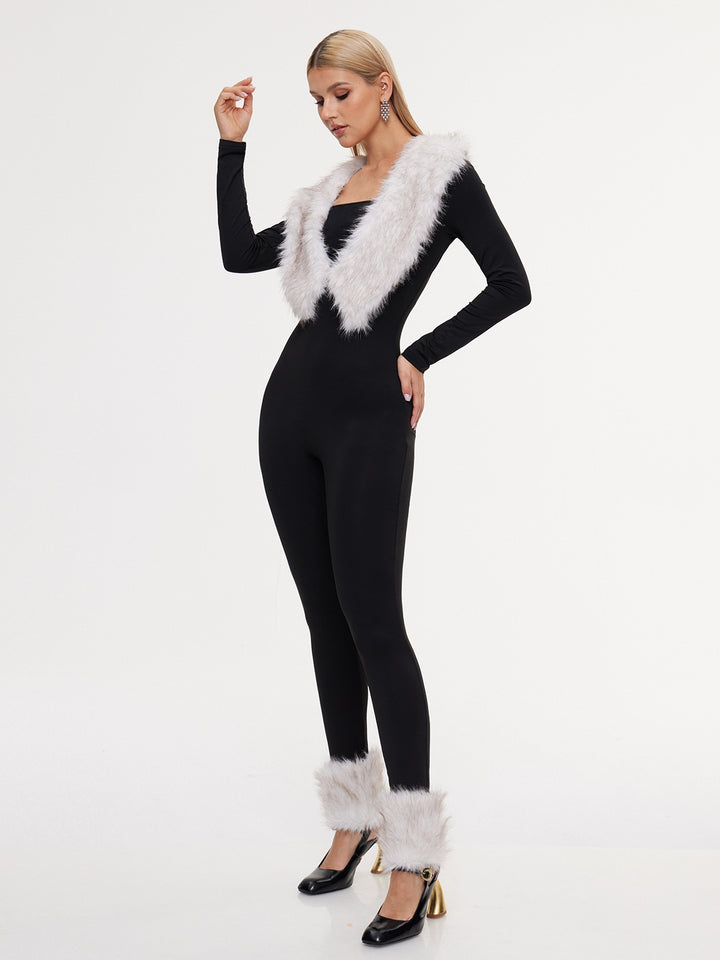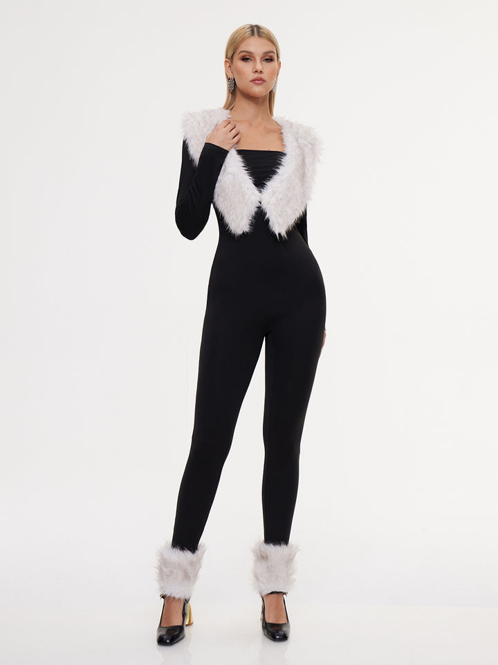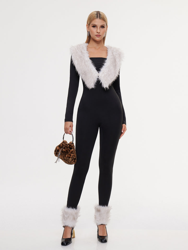 Exodia Plunge Neck Faux Fur Jumpsuit With Footmuffs