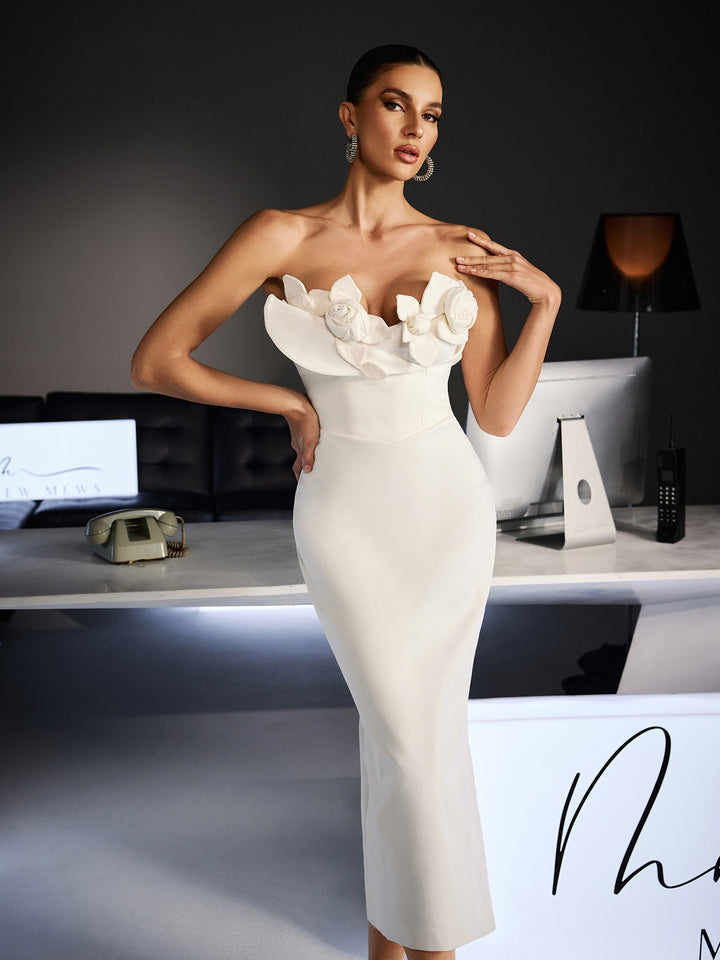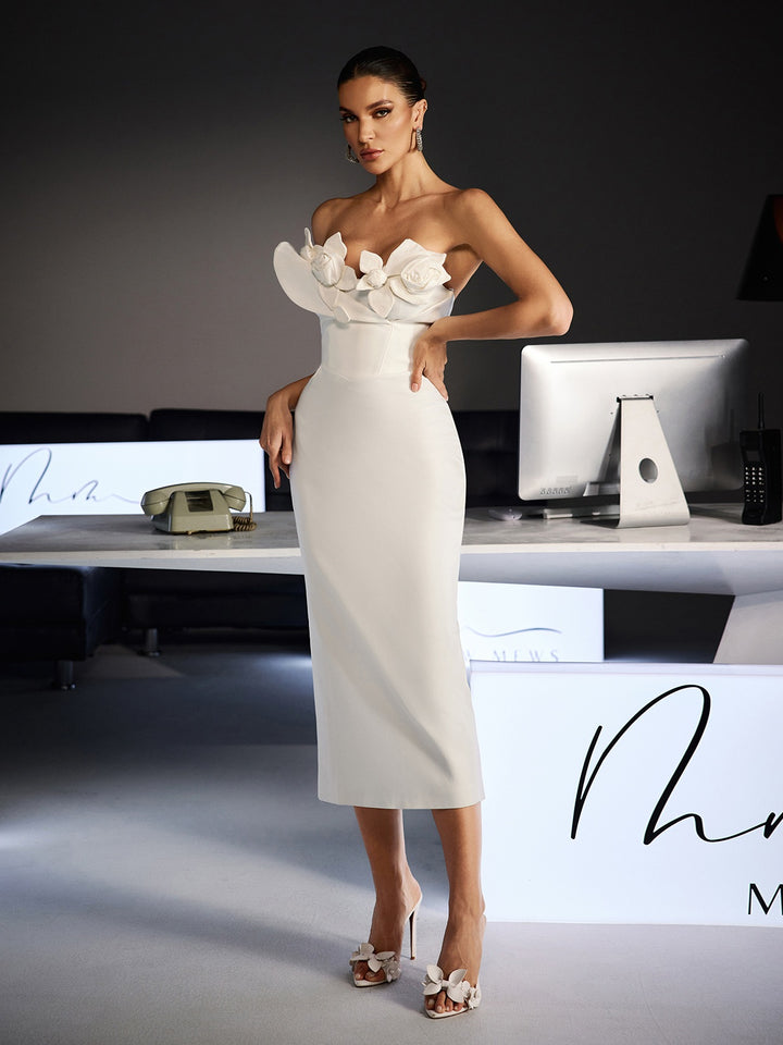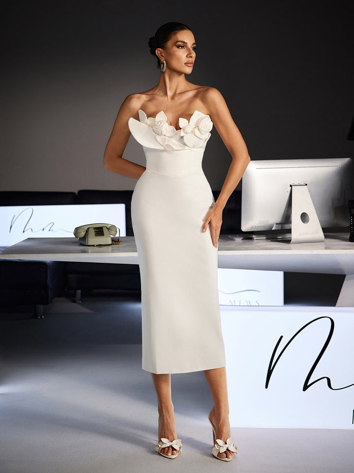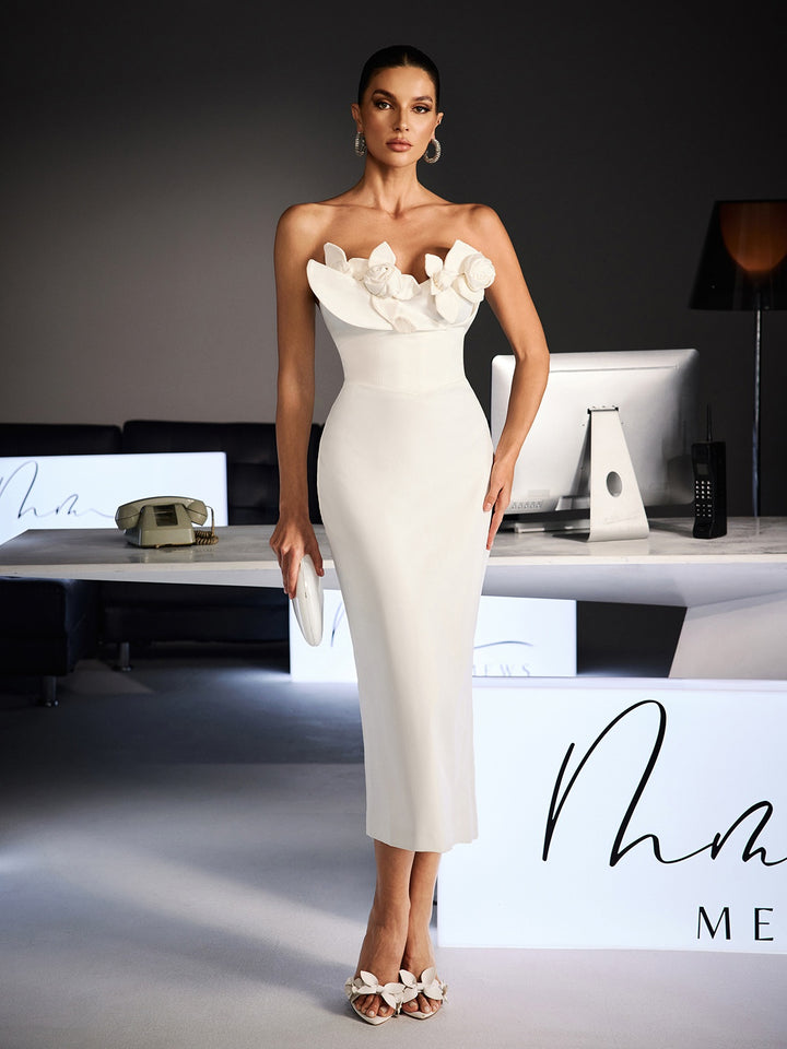 Embrace effortless elegance with the Feruza Strapless Flower Bodycon Midi Dress. This stunning piece features a flattering strapless neckline and a sculpted bodycon silhouette that celebrates your curves while the midi length offers sophisticated coverage. The delicate floral print adds romantic charm and versatility, making it perfect for date nights, garden parties, or upscale casual occasions. The fitted design creates a polished, put-together look that transitions seamlessly from day to evening. Crafted for comfort and confidence, this dress is your go-to choice for making a memorable impression.