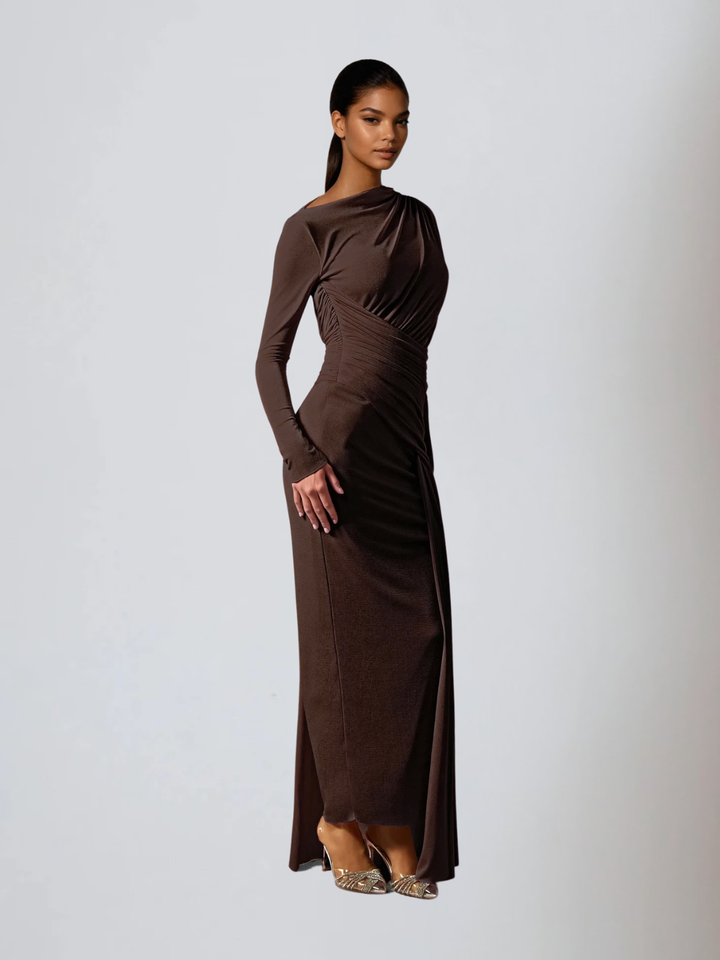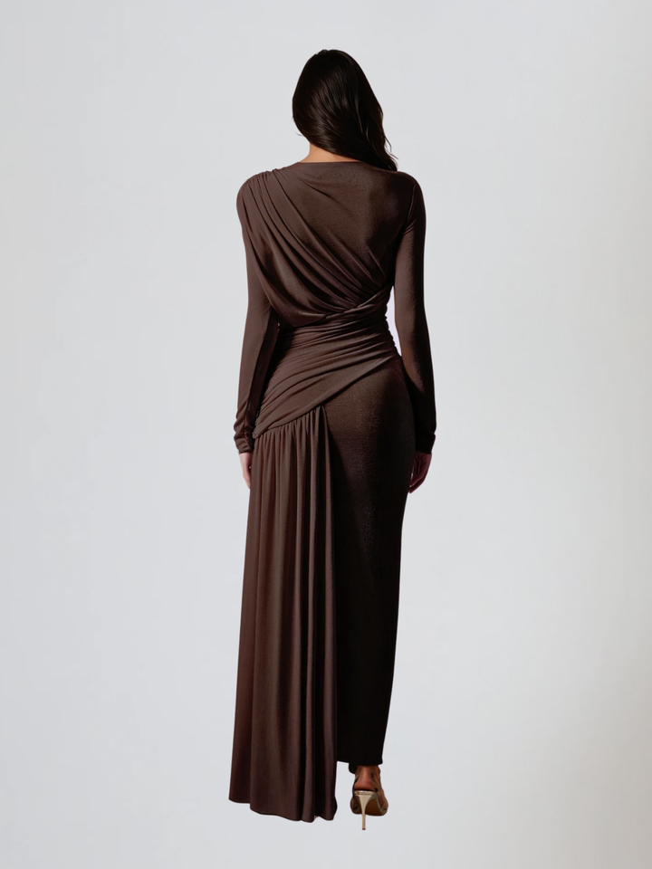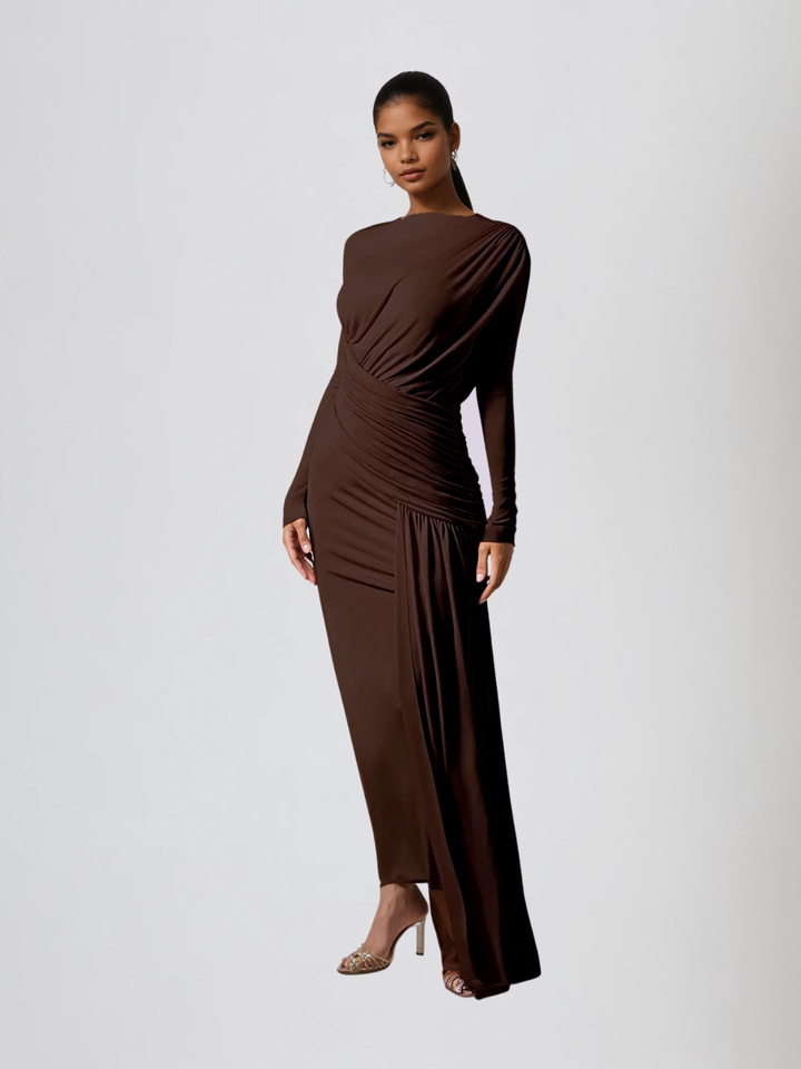 Hibera Long Sleeve Ruched Split Maxi Dress In Coffee