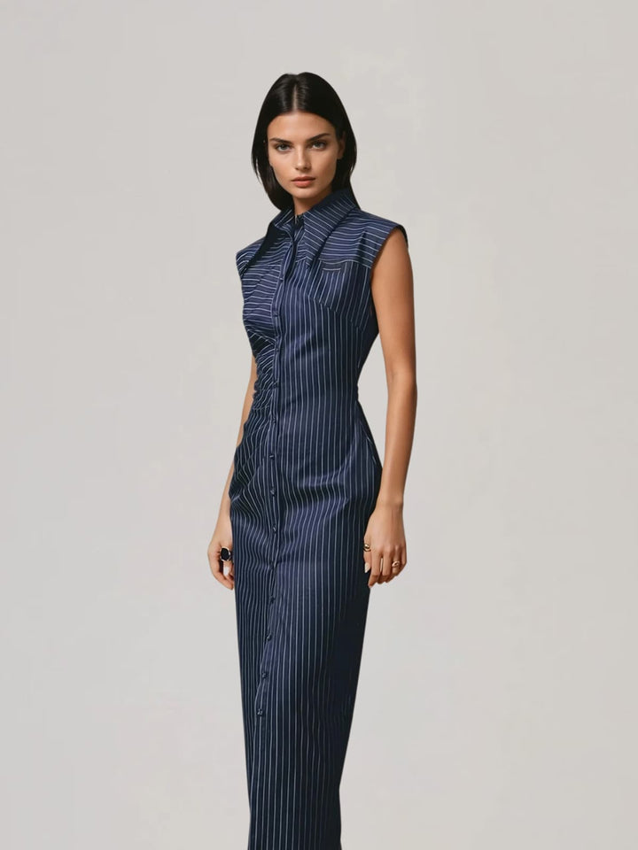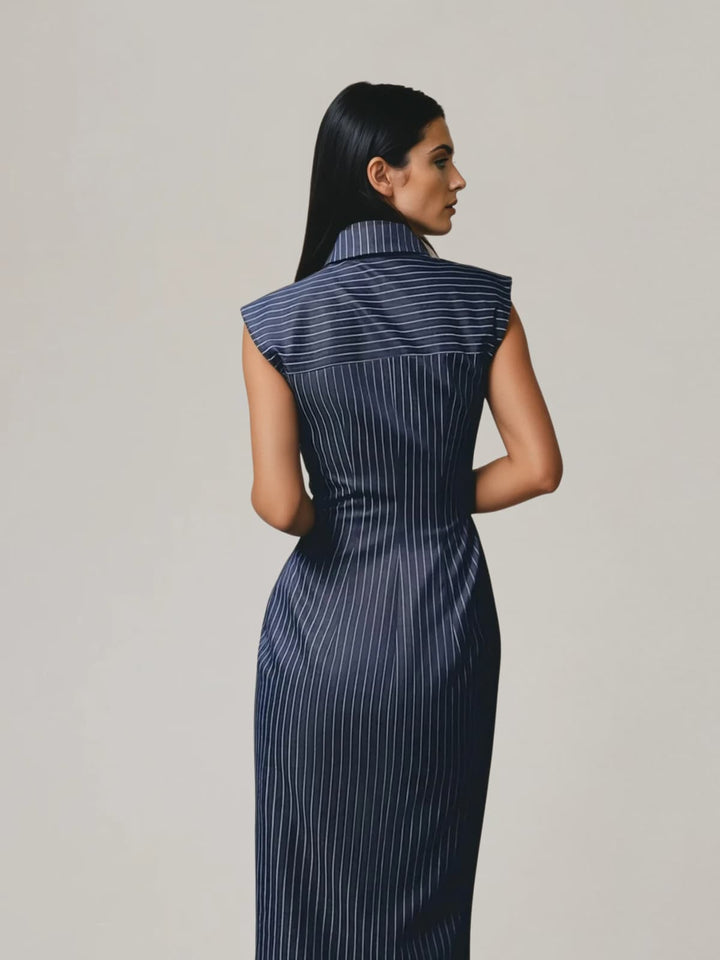 Elevate your wardrobe with the Hyeto Folded Collar Stripe Button Up Maxi Dress—a timeless piece that seamlessly transitions from day to evening. The distinctive folded collar adds sophisticated detail, while classic stripes create visual interest and flattering dimension. Featuring a full-length silhouette and convenient button-up front, this dress offers effortless elegance with practical style. Perfect for those who appreciate refined, versatile pieces that work as hard as you do.