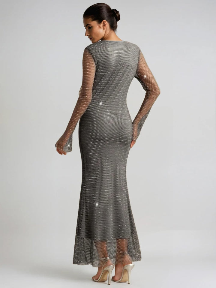 Isograv V Neck Rhinestone Mesh Maxi Dress