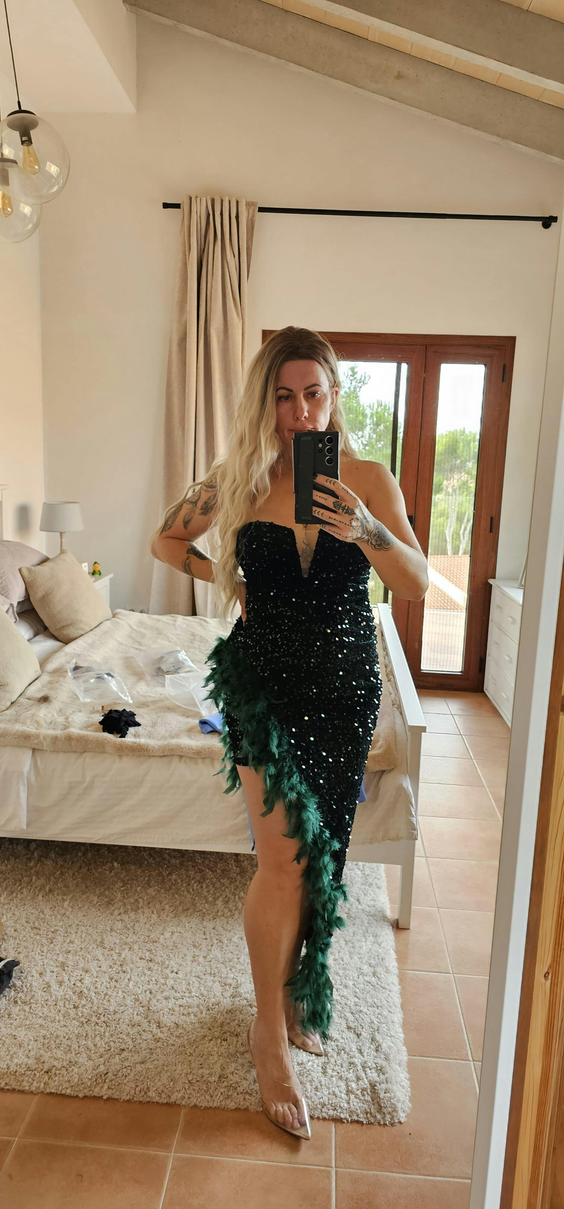 Make a statement in this Lois Strapless Sequin Feather Trimmed Maxi Dress In Emerald. High low leg slit lined in feather and glamourous sequins. Strapless sweetheart neckline and corset back for that perfect fit.