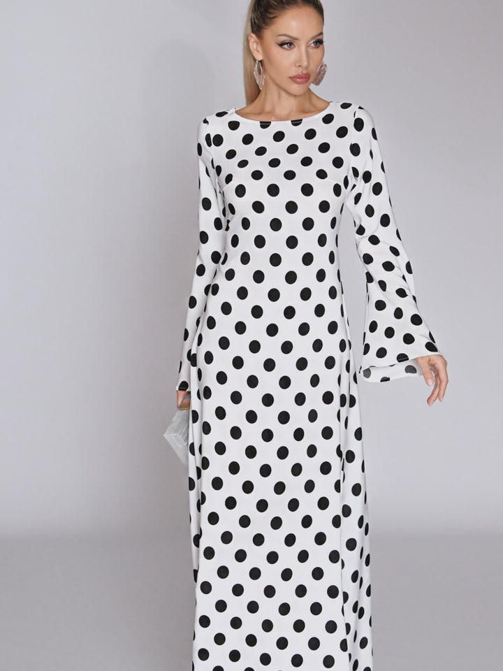 Experience timeless elegance with the Lucero Flare Sleeve Dot Maxi Dress. Featuring playful dot patterns and dramatic flare sleeves, this maxi dress offers a graceful silhouette that moves beautifully. Perfect for both casual and dressy occasions, it blends classic charm with a modern twist to keep you effortlessly stylish.