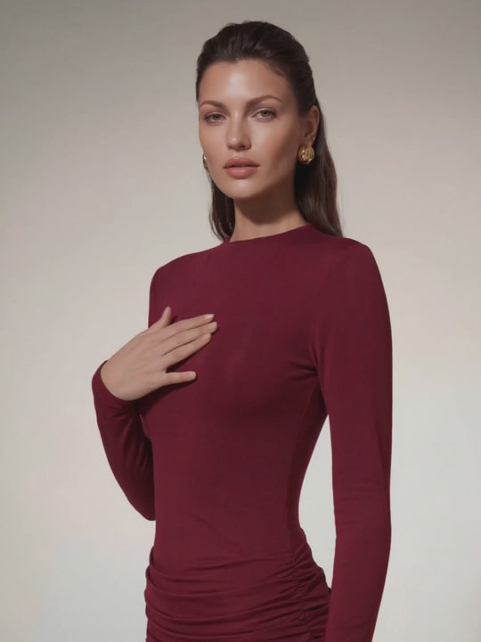 Elevate your wardrobe with the Lyubov Long Sleeve Ruched Dress in Wine—a sophisticated piece that combines timeless elegance with modern appeal. The rich wine hue flatters all skin tones, while strategically placed ruching creates a flattering silhouette that accentuates your curves beautifully. Long sleeves offer versatile styling options for any season, making this dress perfect for everything from casual outings to special occasions. The luxurious fabric drapes gracefully, ensuring comfort without compromising on style. Whether you're dressing up for an evening out or down for brunch, this dress is your go-to choice for looking polished and put-together.