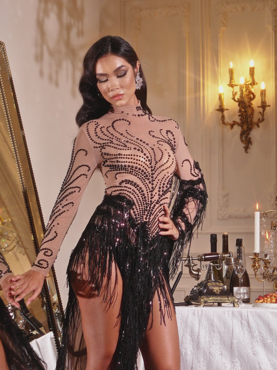 Make a powerful statement in the Ezron High Neck Rhinestone Fringe Bodysuit in Black, where classic sophistication meets dazzling glamour. The refined high neckline offers elegant structure while dynamic fringe detailing adds movement and intrigue. Sparkling rhinestones catch light beautifully across the fabric, creating an irresistible shimmer against the sleek black backdrop. This versatile piece layers effortlessly with skirts, trousers, or worn solo for maximum impact at parties, events, and special occasions. Feel genuinely confident and striking in a design that celebrates your bold sense of style—the perfect choice for those who command attention with timeless elegance and contemporary flair.