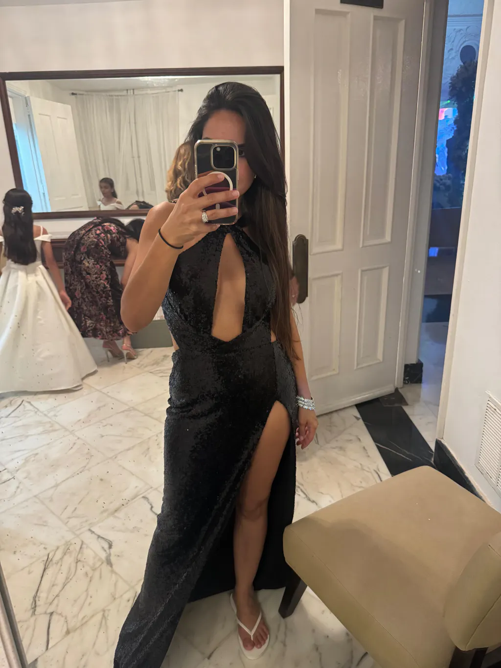 Evoke modern sensuality with the Talia Black Sequin Gown. Comprised of a daring plunge key-hole neck, open back, and thigh-high slit. This gown was crafted to flatter and elongate your silhouette.