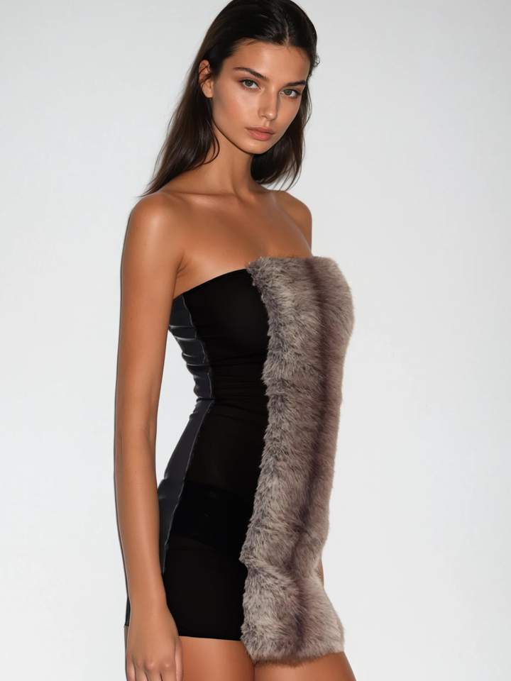 Turn heads effortlessly in the Vazgoth Strapless Mesh Furry Mini Dress. This daring design combines a sheer mesh base with soft furry accents for a bold, tactile contrast. Its strapless cut highlights your neckline and shoulders, while the mini length adds a playful, flirty edge. Perfect for night outs or special occasions, this dress makes a confident statement wherever you go. Embrace your daring side with a look that’s both edgy and captivating.