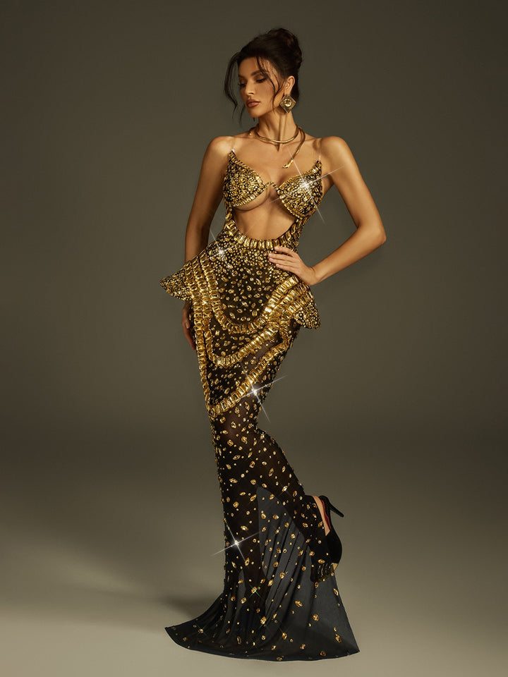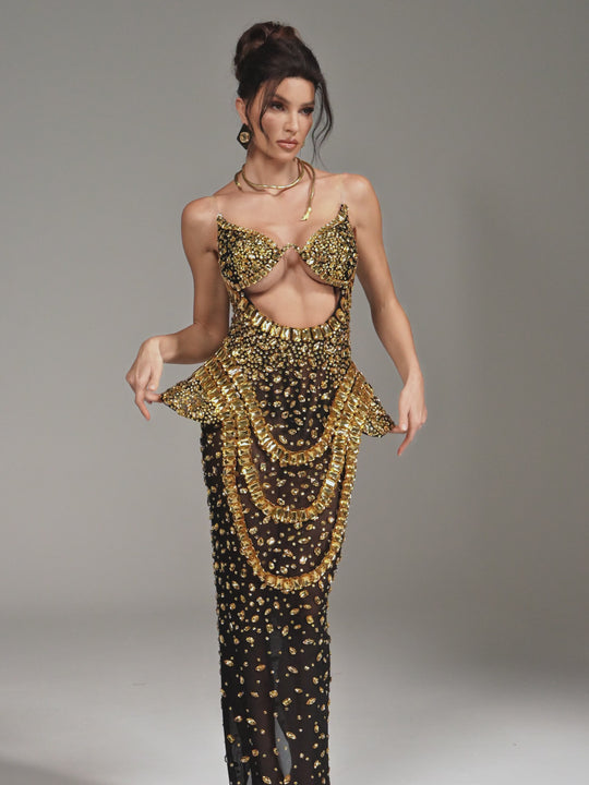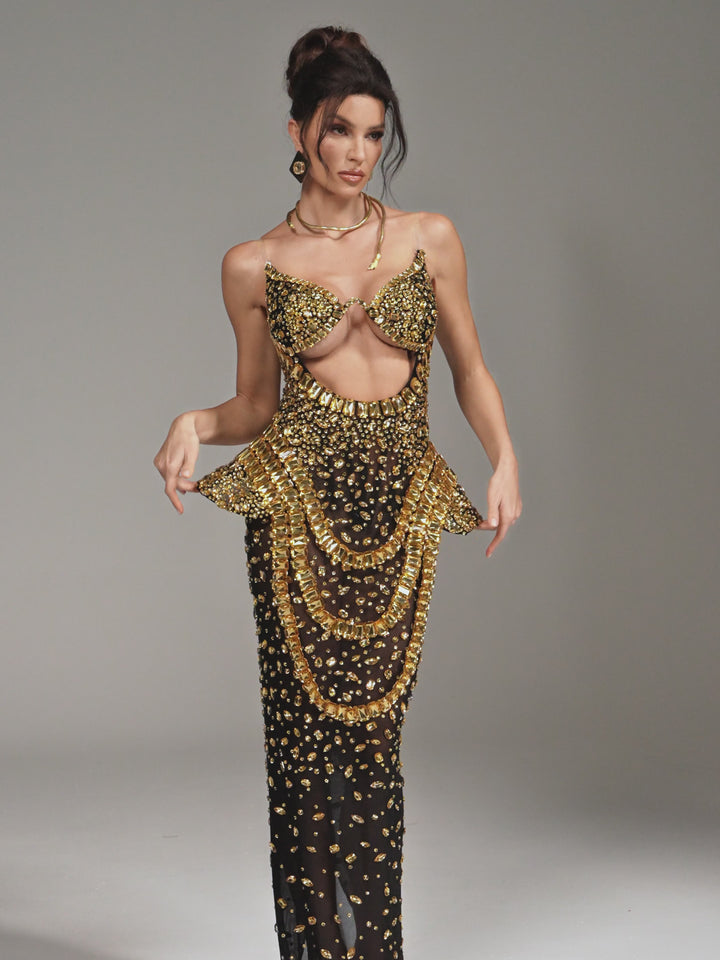 Arygon Strapless Cutout Crystal Maxi Dress In Gold
