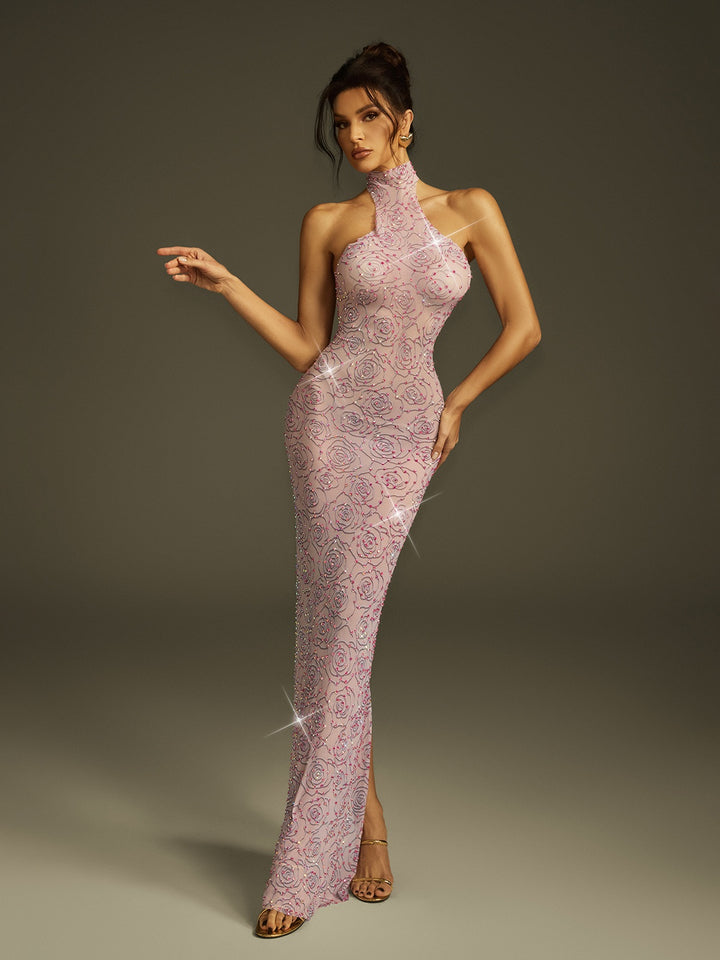 Corinthe High Neck Rhinestone Floral Split Maxi Dress