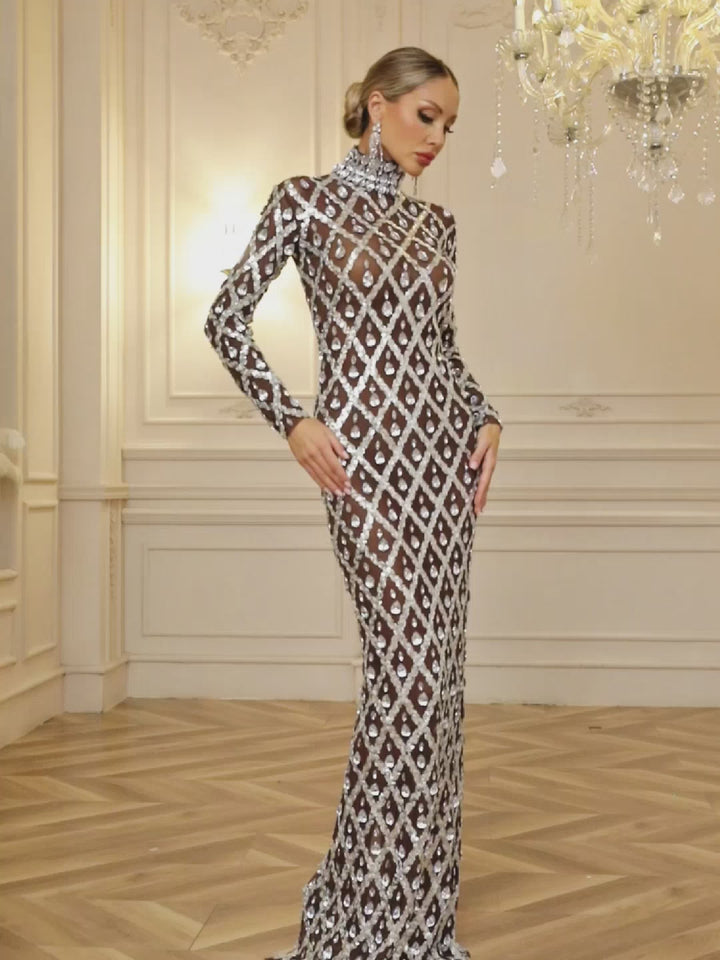 Liora Long Sleeve Sequin Crystal Maxi Dress In Black