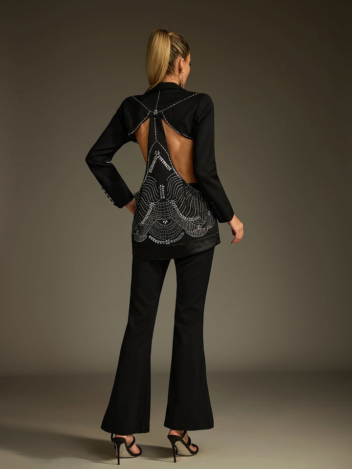 Make a bold entrance with the Lucius Rhinestone Cutout Blazer Set, where sharp tailoring meets dazzling detail. This set features a sleek blazer with eye-catching rhinestone accents and daring cutouts that highlight your confidence and style. Perfect for elevating any event or night out, it combines modern edge with polished sophistication. Step into this striking ensemble to showcase your bold fashion sense and leave a lasting impression.