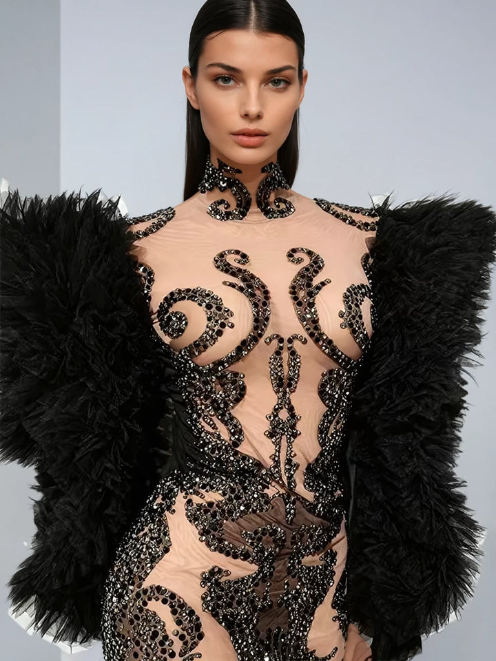 Vazrik High Neck Tulle Rhinestone Mini Dress
